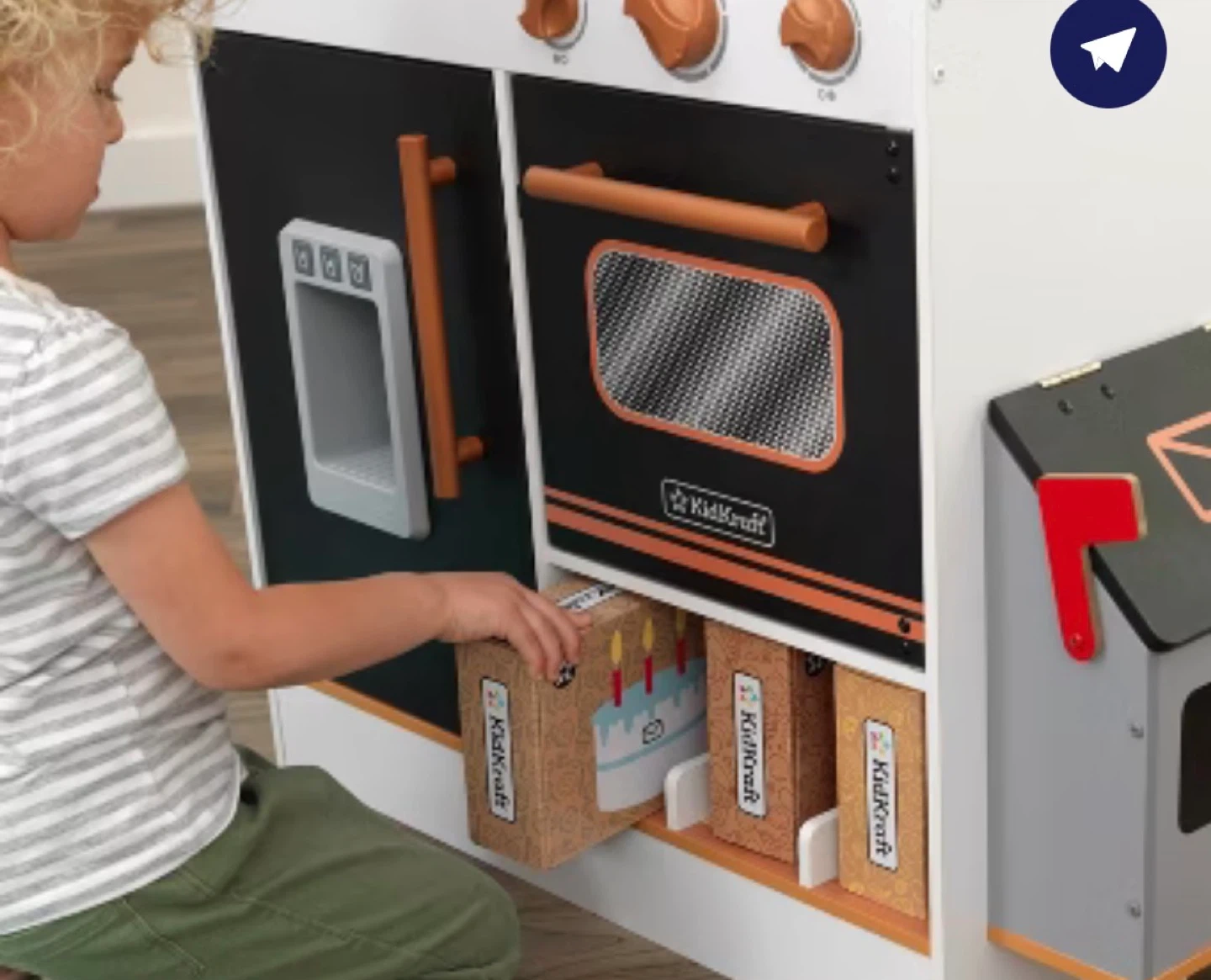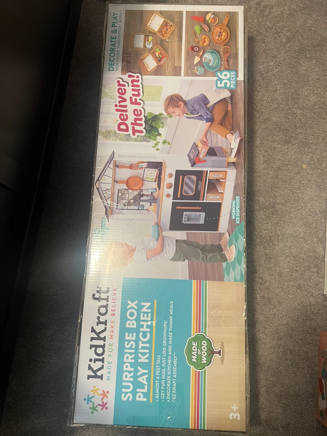 KidKraft Surprise Box Play Kitchen, made of wood. It comes with 56 pieces for decorating and playing. Assembly is easy with EZ Kraft Assembly.