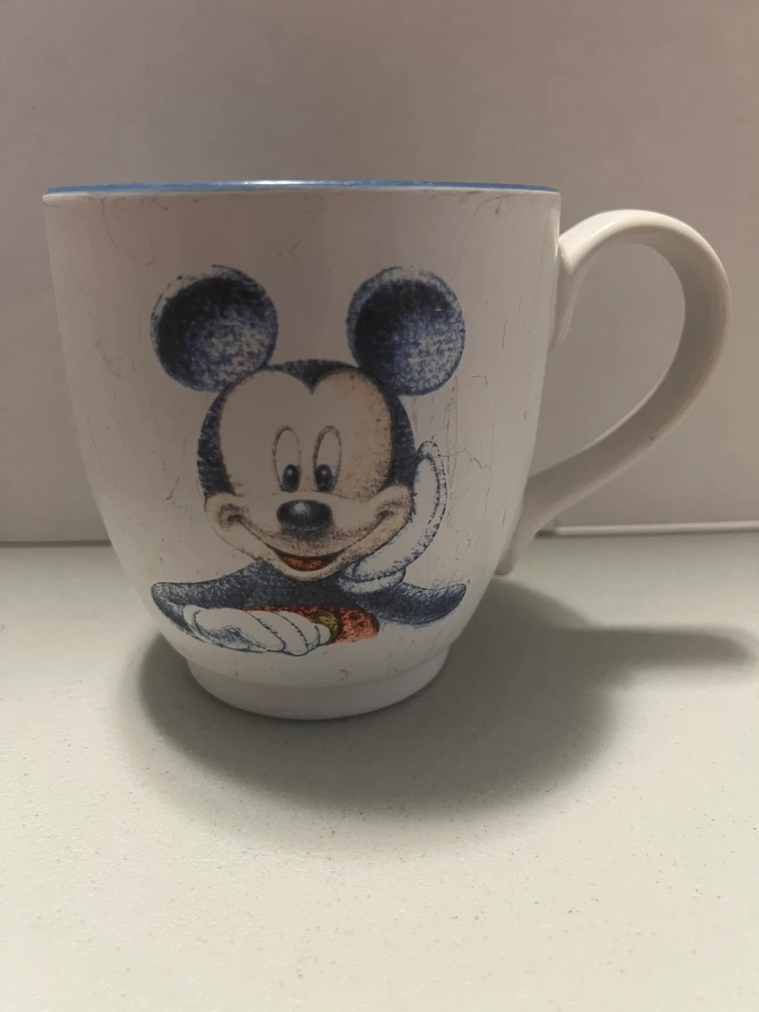 •Color: White on the outside, with a silhouette of Mickey Mouse on both sides of the mug, and blue on the inside of the mug.