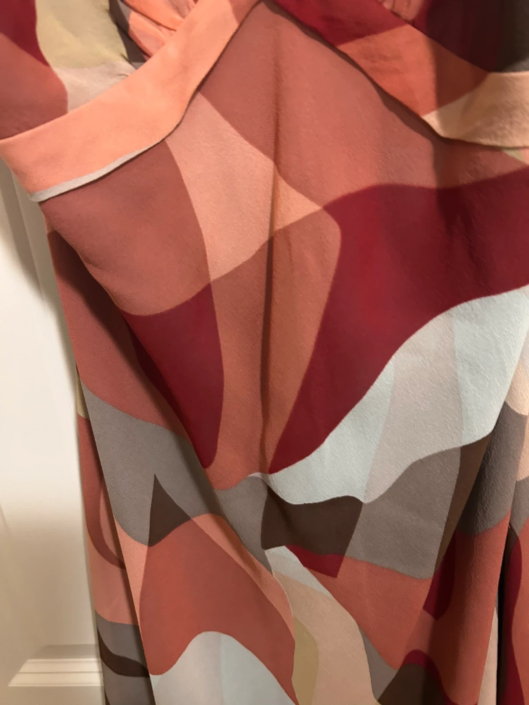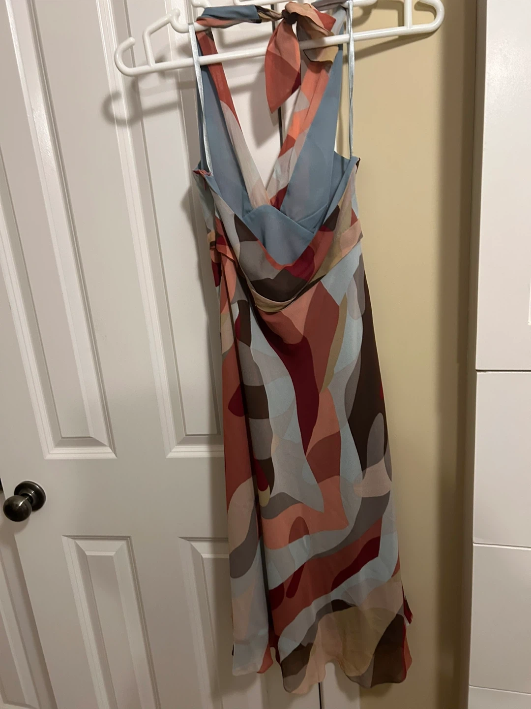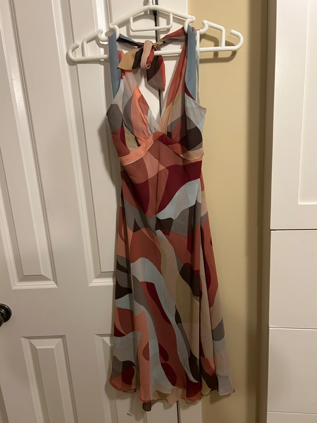 This is a BCBGMAXAZRIA halter neck dress with a colourful abstract print. It's a size 10 and made in China. The dress features a flowing, lightweight fabric perfect for warmer weather.