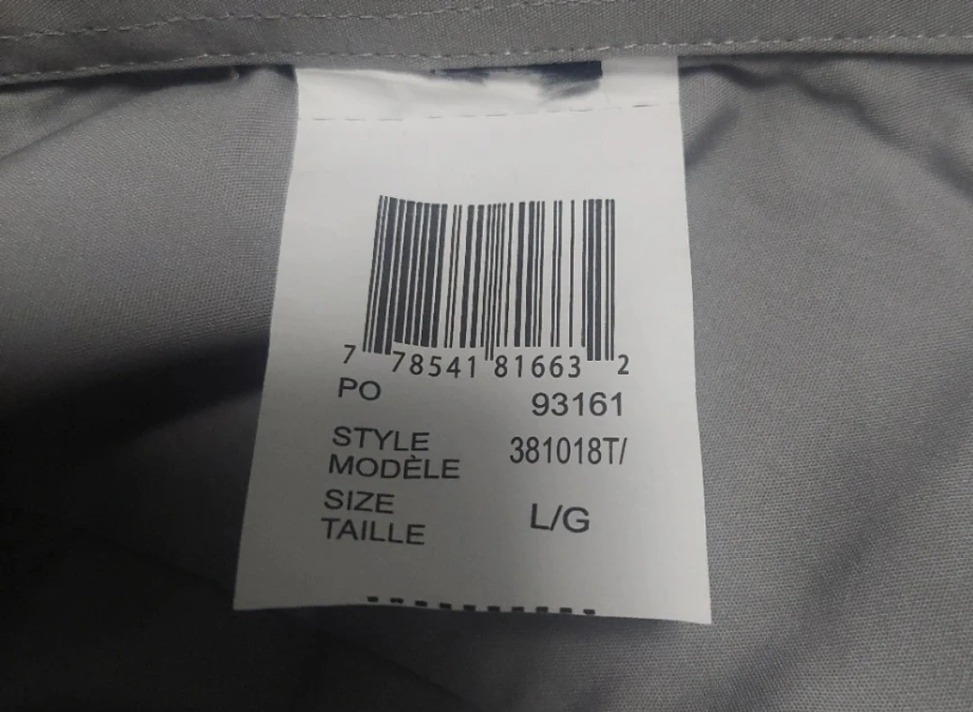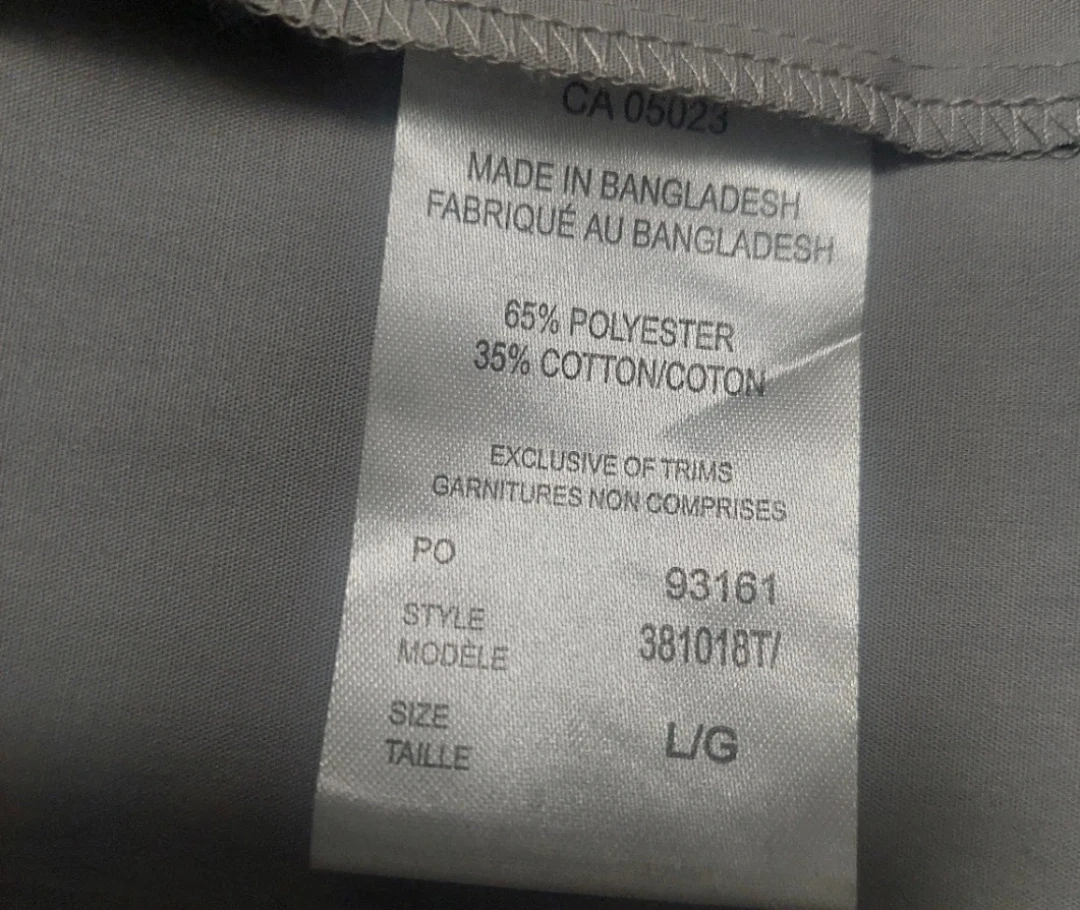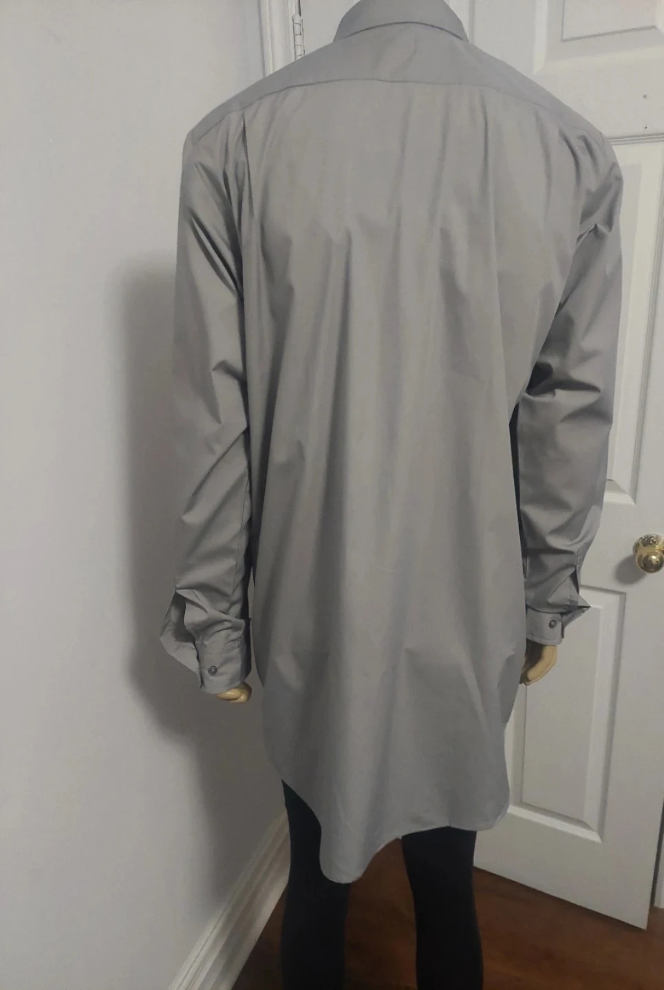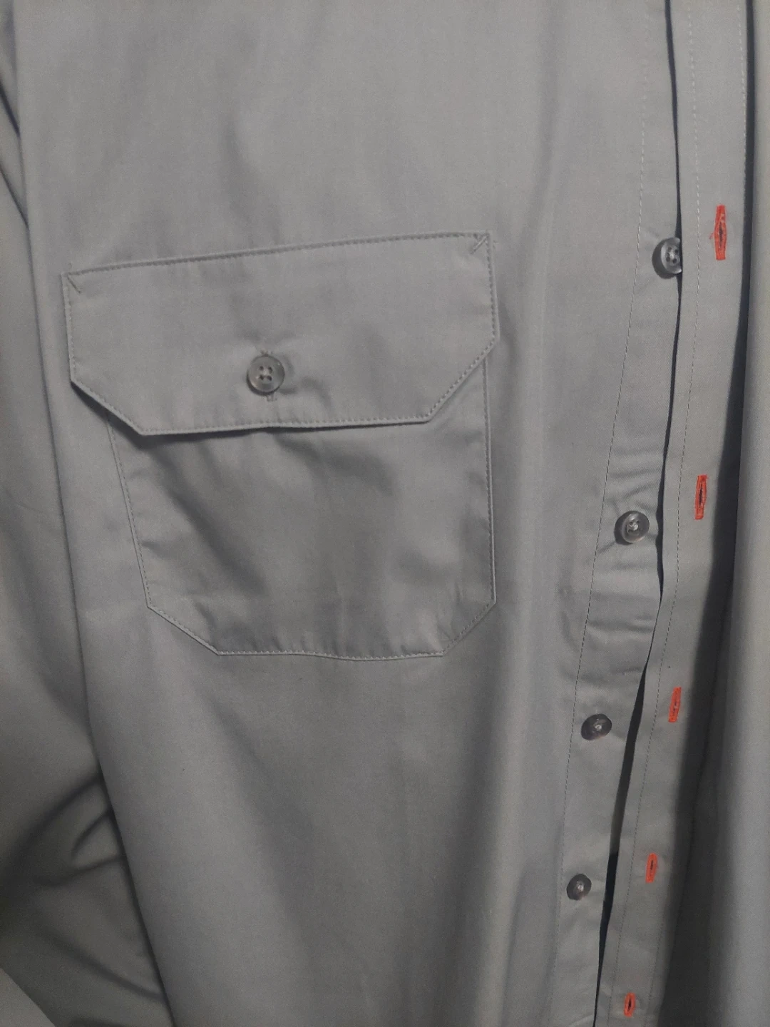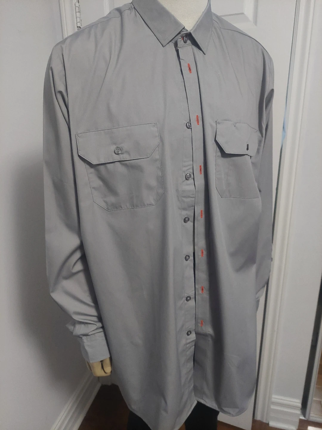 This is a grey long-sleeve shirt for Tall men over 6 feet. It's made of 65% polyester and 35% cotton. It has two chest pockets. It's a size L/G.