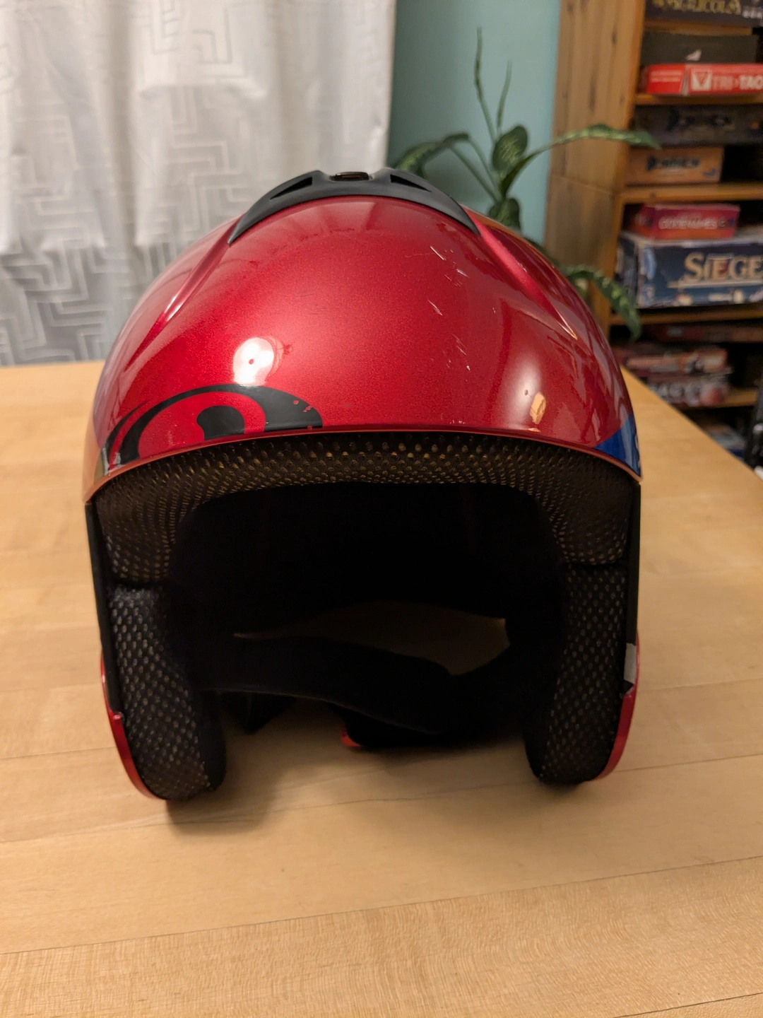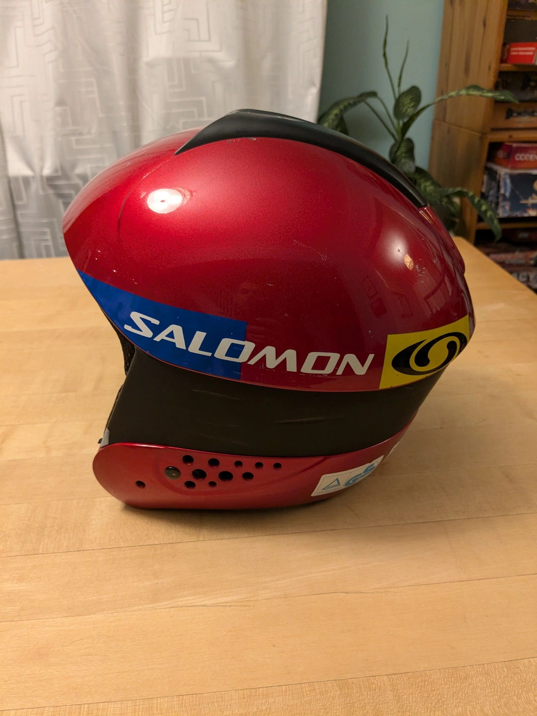 Large red Salomon ski racing helmet. It is older, is missing the goggle clip on the back, and has scratches on the finish, but the padding and strapping are in good condition. Has a vent at the top for warmer weather.