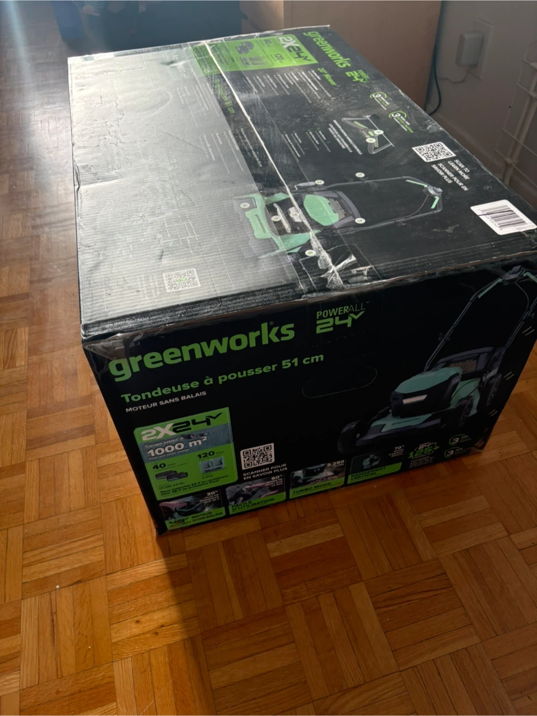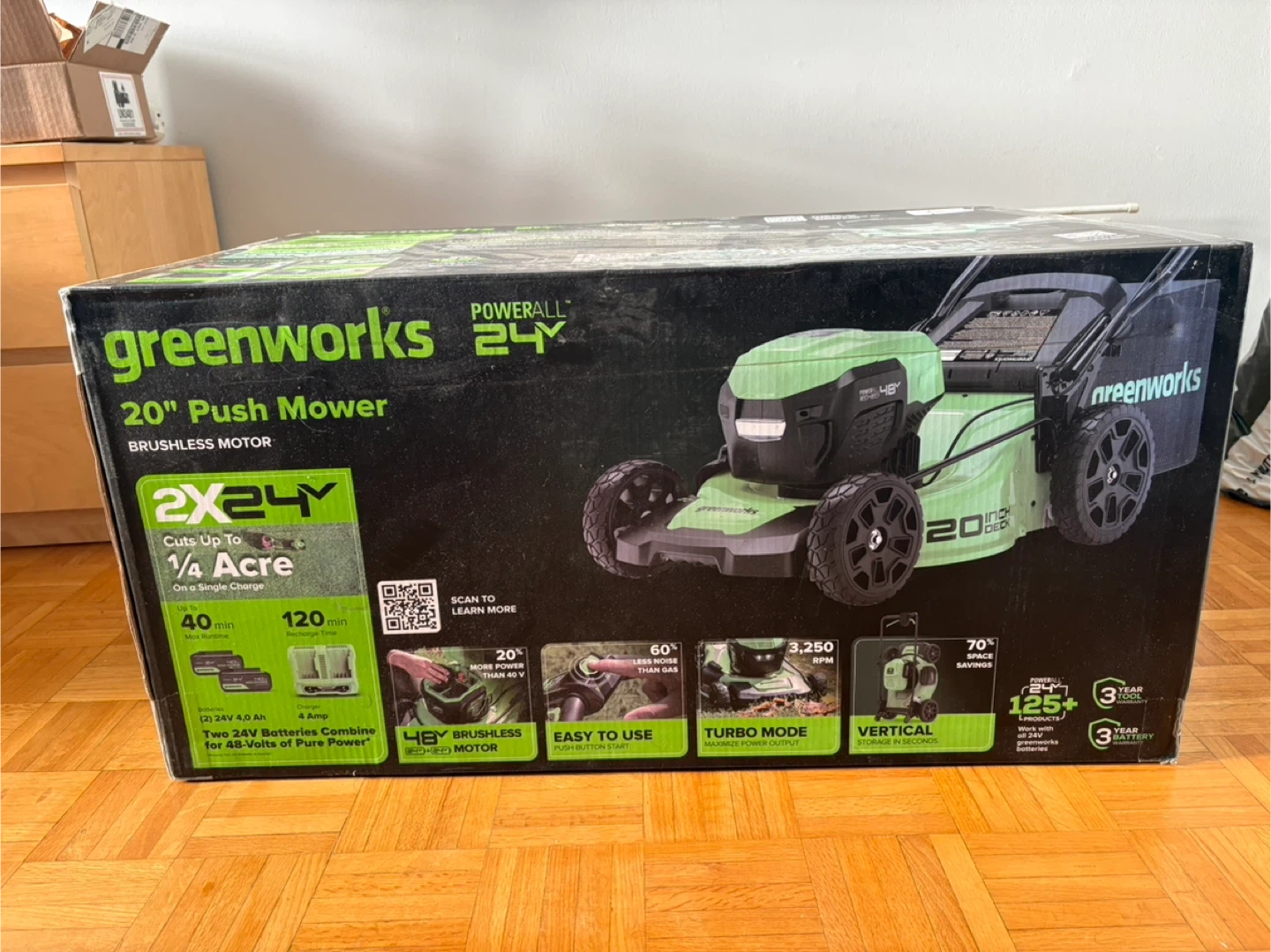 Greenworks 20 inch push mower with brushless motor. It runs on two 24V batteries. Covers up to 1/4 acre on a single charge, with 40 minutes run time. Includes original box and manual.