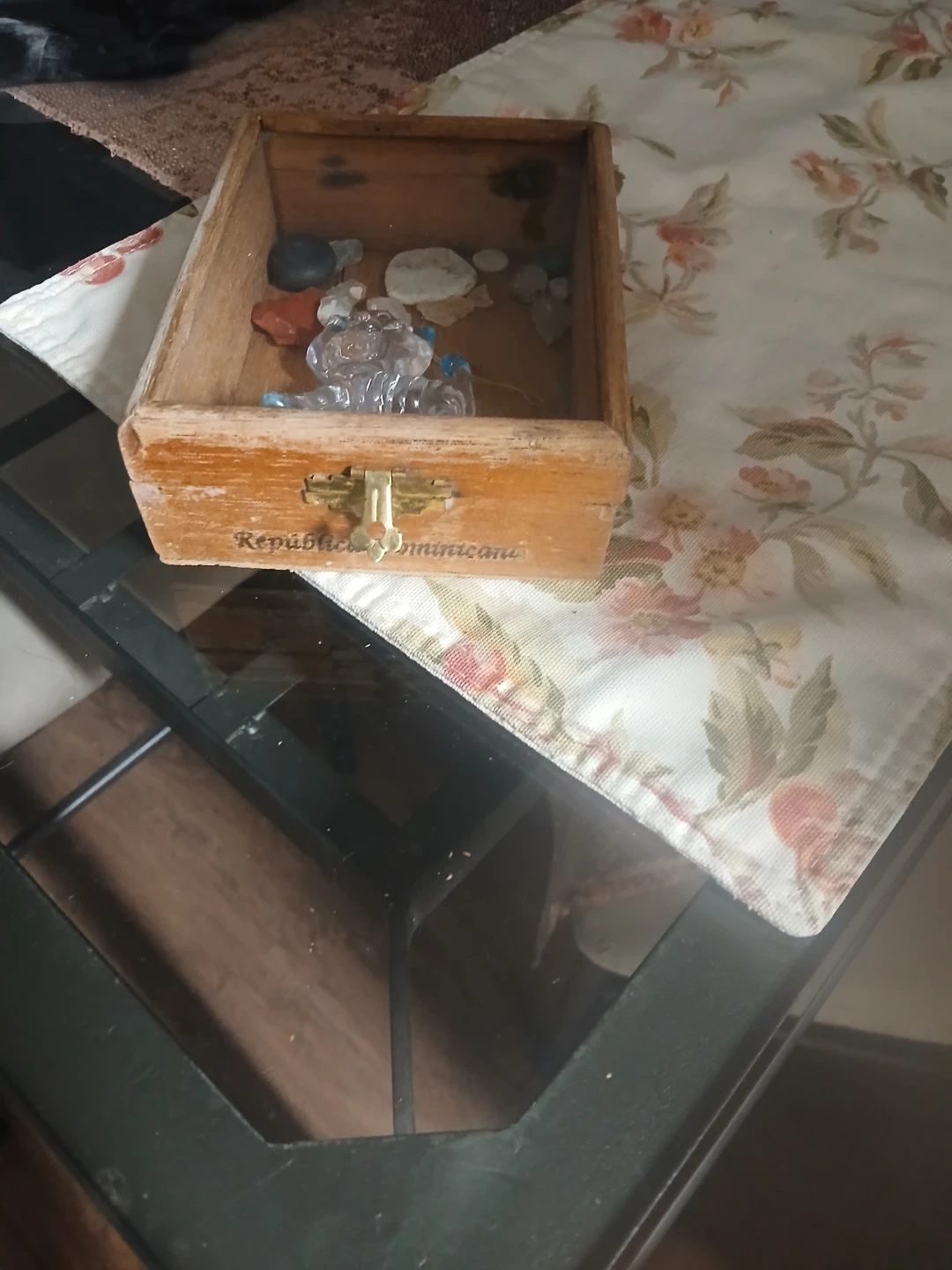 This charming wooden box features a glass-blown cat figurine inside, along with assorted decorative stones. It's a lovely decorative piece for any tabletop. The box has a brass latch and hinges. It's perfect for storing small keepsakes!