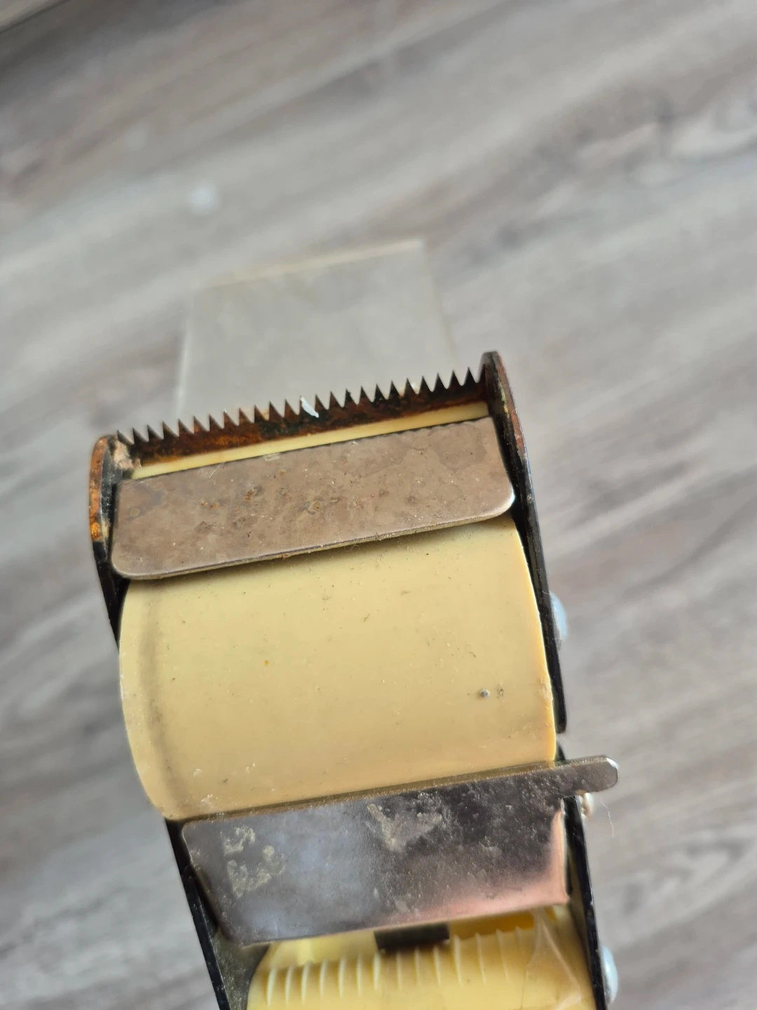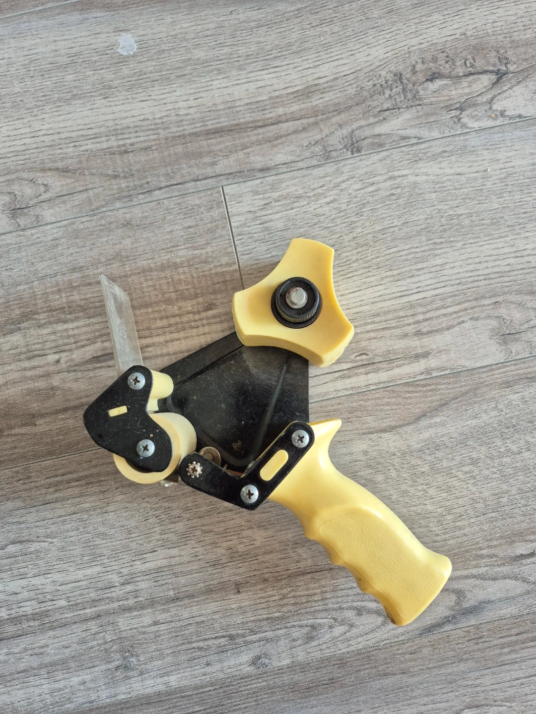 A sturdy tape dispenser with a yellow handle. It's made of durable plastic and metal parts. This tool is handy for sealing boxes quickly!