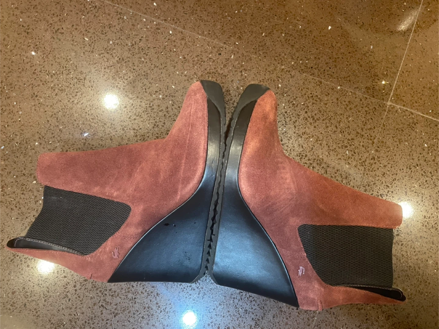 Women's Lacoste ankle boots with a wedge heel. Features suede upper and elastic side panels. The outsole has a diamond tread pattern.