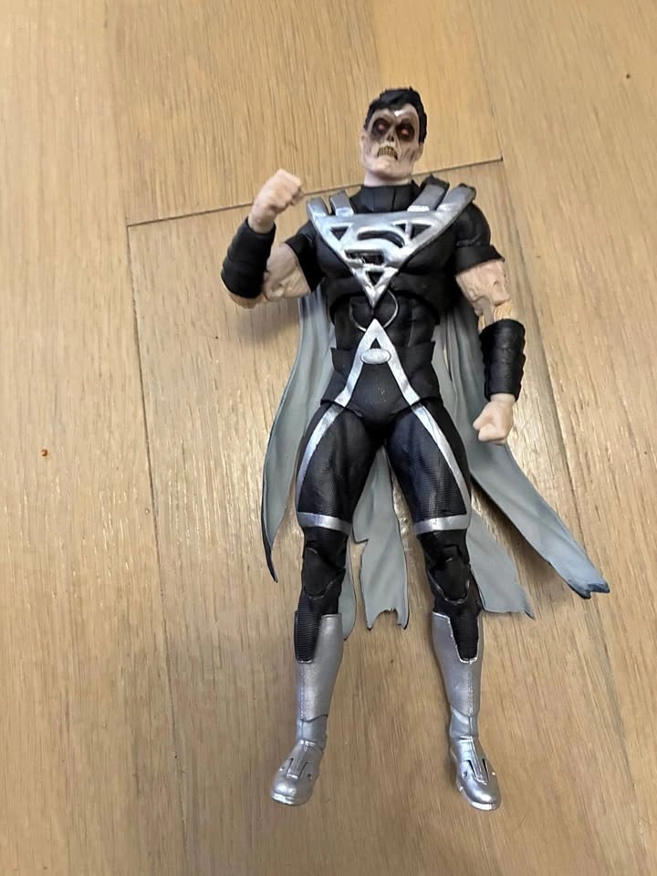 This is a McFarlane Toys DC Multiverse Blackest Night Black Lantern Superman 7-inch action figure. Character: Black Lantern Superman (Earth 2) from the "Blackest Night" storyline. Features: Detailed zombie head sculpt with red eyes, black markings, and a torn cape. Articulation: Includes double-jointed elbows and knees, allowing for a good range of posing. Sells for $20 online.