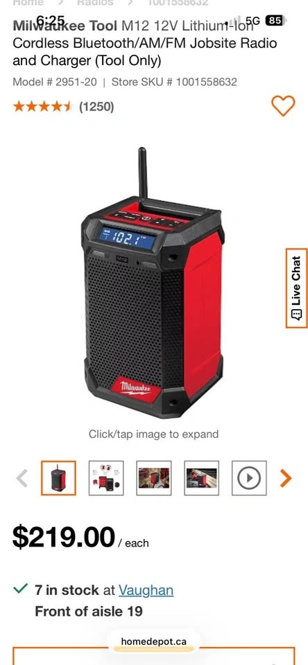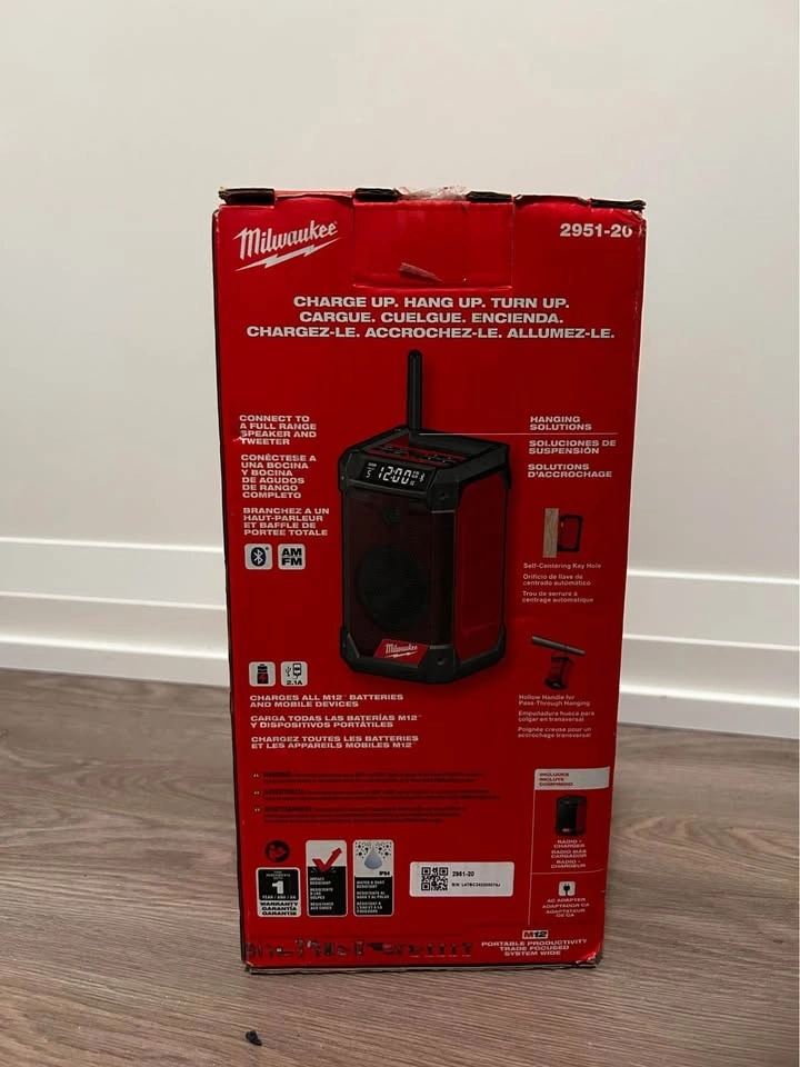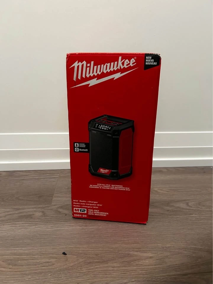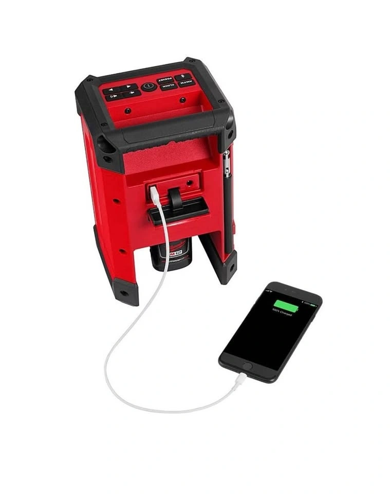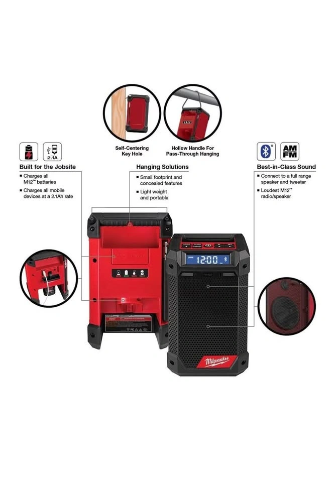 Milwaukee M12 Bluetooth AM/FM jobsite radio and charger. Charges M12 batteries and mobile devices at 2.1Ah. Has a full range speaker and tweeter for great sound. Super portable with a small footprint. Built-in hanging solutions too. Tool only, no battery.