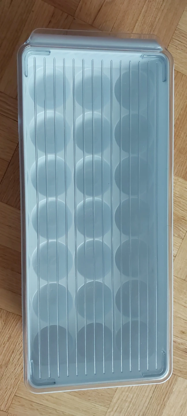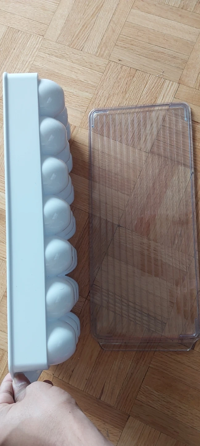 This is a 12-egg holder with a lid. It's made of white plastic and clear plastic. Keep your eggs fresh and organized in the fridge!