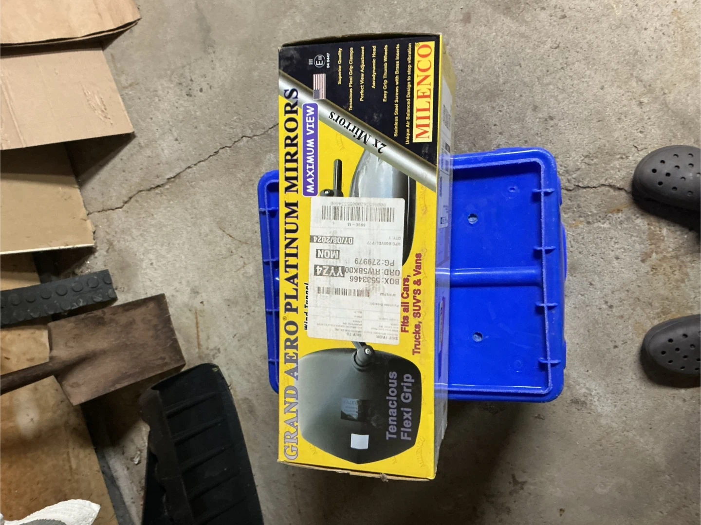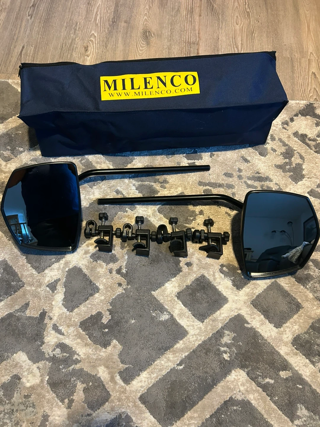 Milenco towing mirrors for vehicles. These are extendable mirrors with clamps for secure attachment. They come with a dark blue storage bag. This set includes both left and right mirrors.