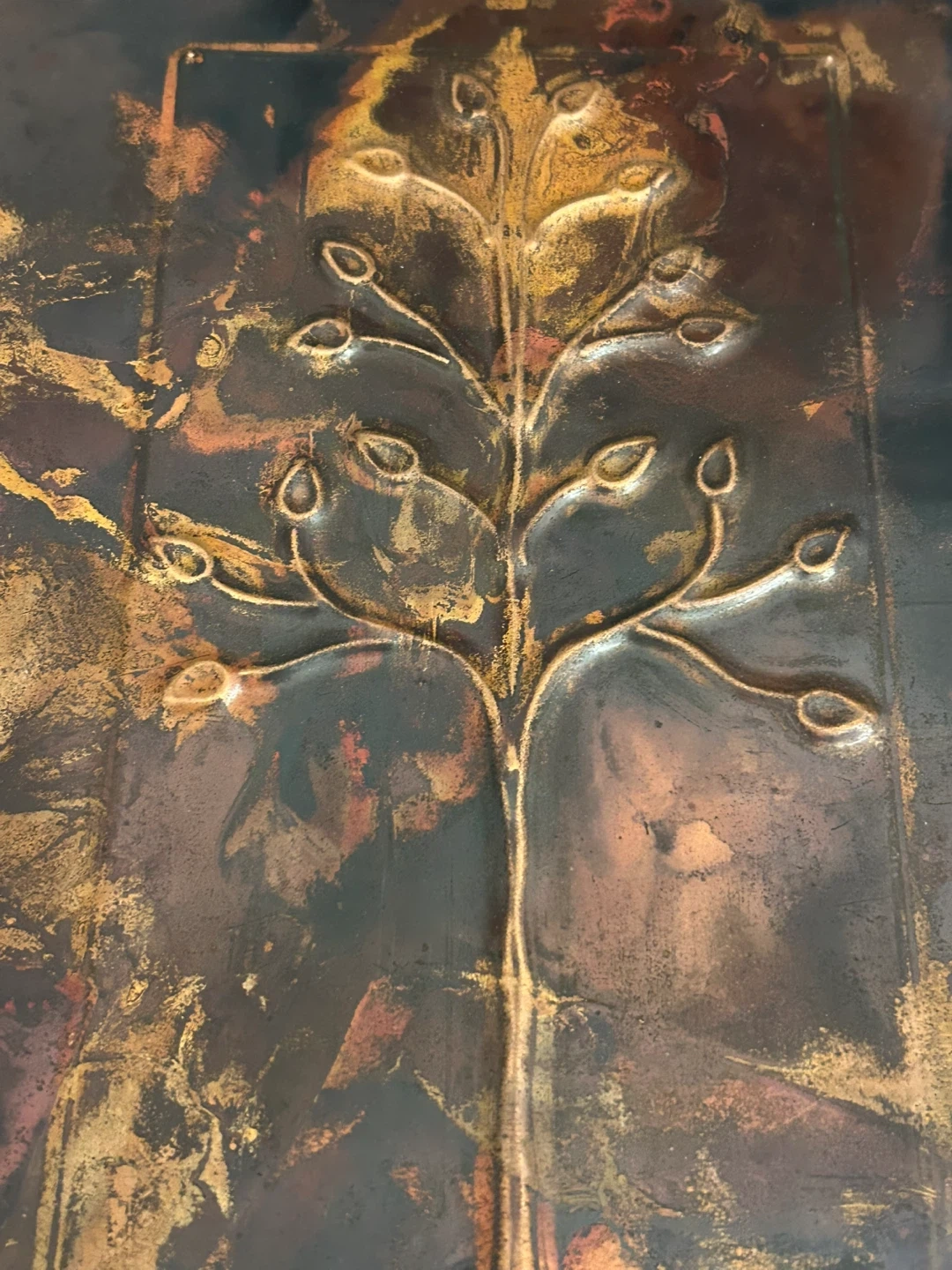 Stunning vintage Marcen Beucler copper wall hanging in a bold Brutalist / Mid-Century Modern style. This handcrafted piece features an embossed “Tree of Life” design and a rich, fiery patina achieved through torch-firing and acid-etching techniques, giving it depth, texture, and striking visual character.