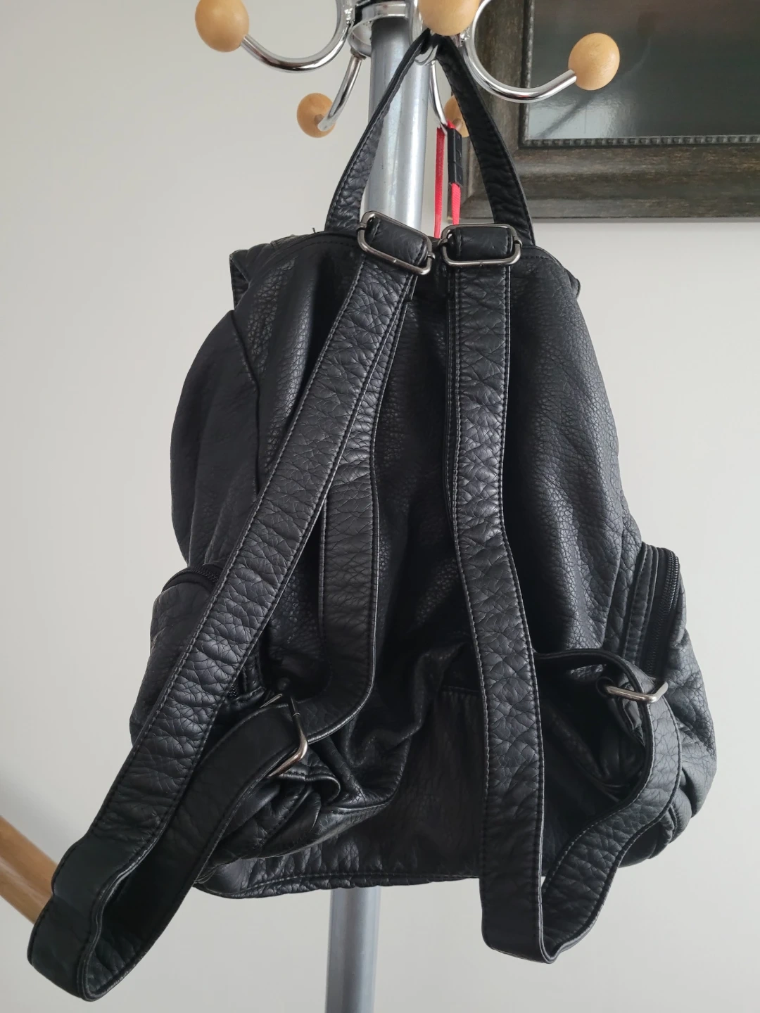 This black faux leather backpack features stylish silver stud accents. It has adjustable shoulder straps for comfort. Great for everyday use!