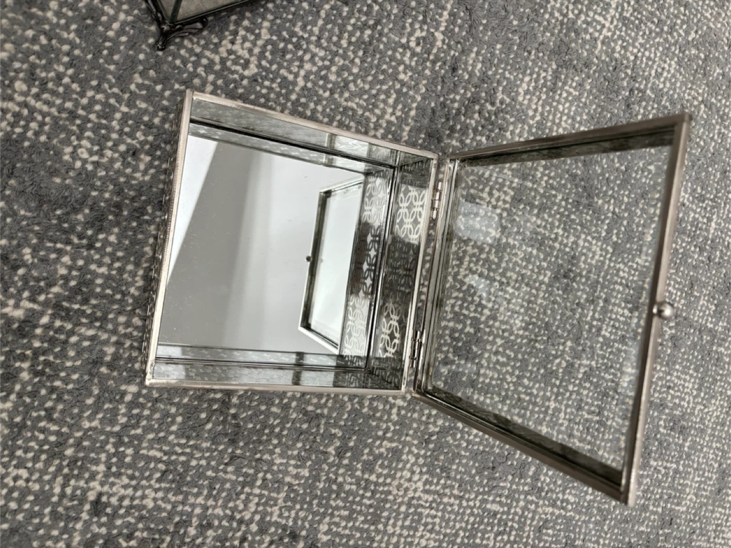Two glass jewelry boxes for storing rings and trinkets. One features a detailed silver-toned filigree design and a mirrored interior. The other is a larger rectangular box with a ring organizer insert.