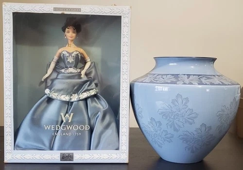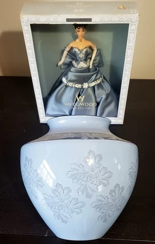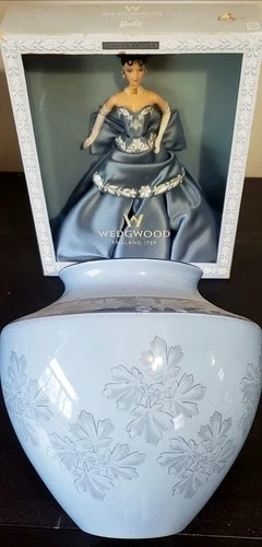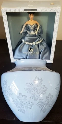 This exquisite Wedgwood Gift Set is a true collector's treasure. Featuring the iconic Wedgwood Barbie, this set also includes a beautifully crafted Wedgwood Interiors large Jardiniere Vase from 1999, in the same beautiful color and pattern to complement the doll. This set is perfect for any fan of Barbie, unique and decorative collectibles, or Wedgwood enthusiasts. The Barbie doll is brand new in its original box, making it a great addition to any collection or display. The matching Jardiniere Vase adds a touch of elegance to any room and is sure to be a conversation starter. Don't miss your chance to own this stunning Wedgwood Gift Set.