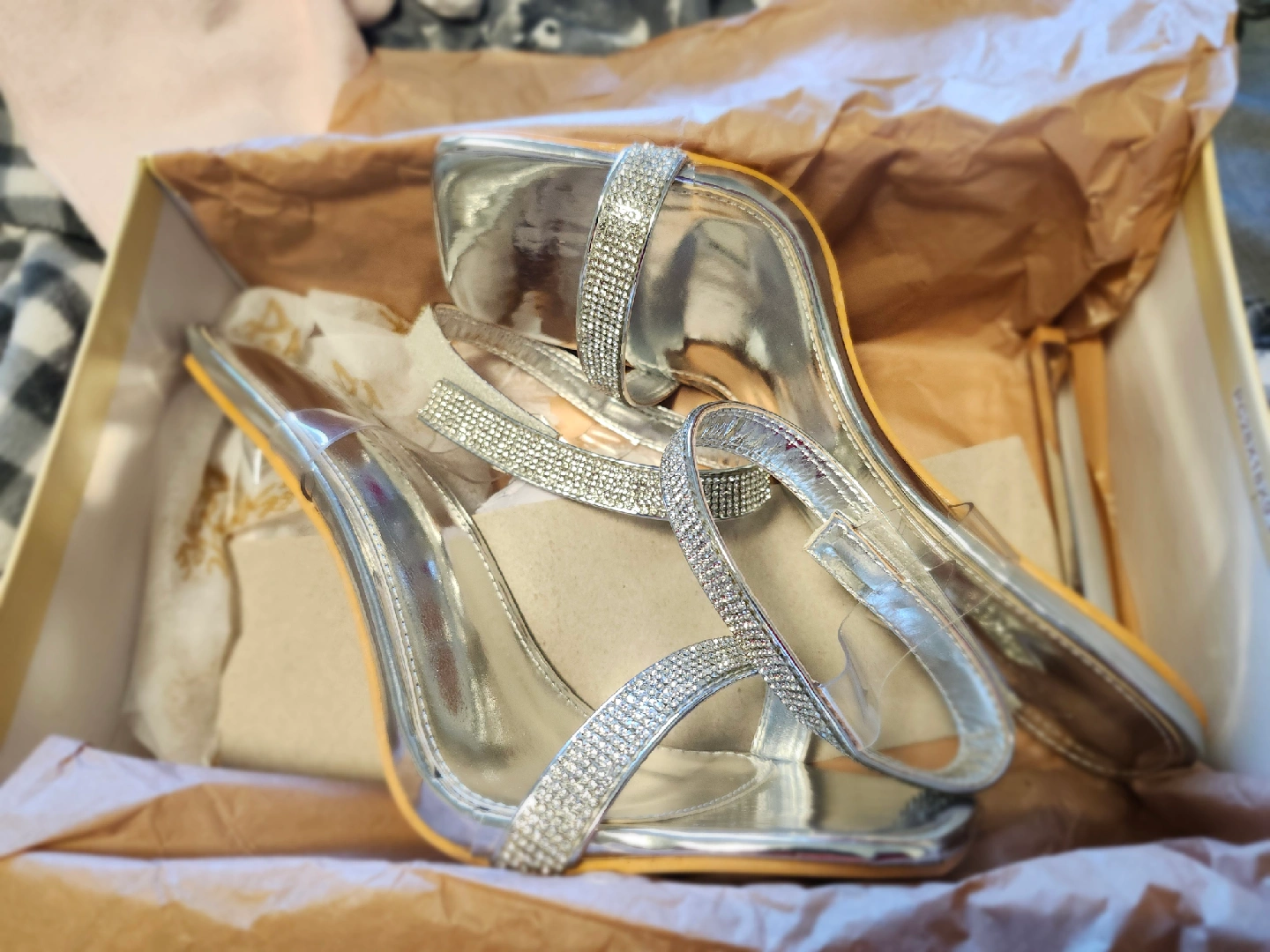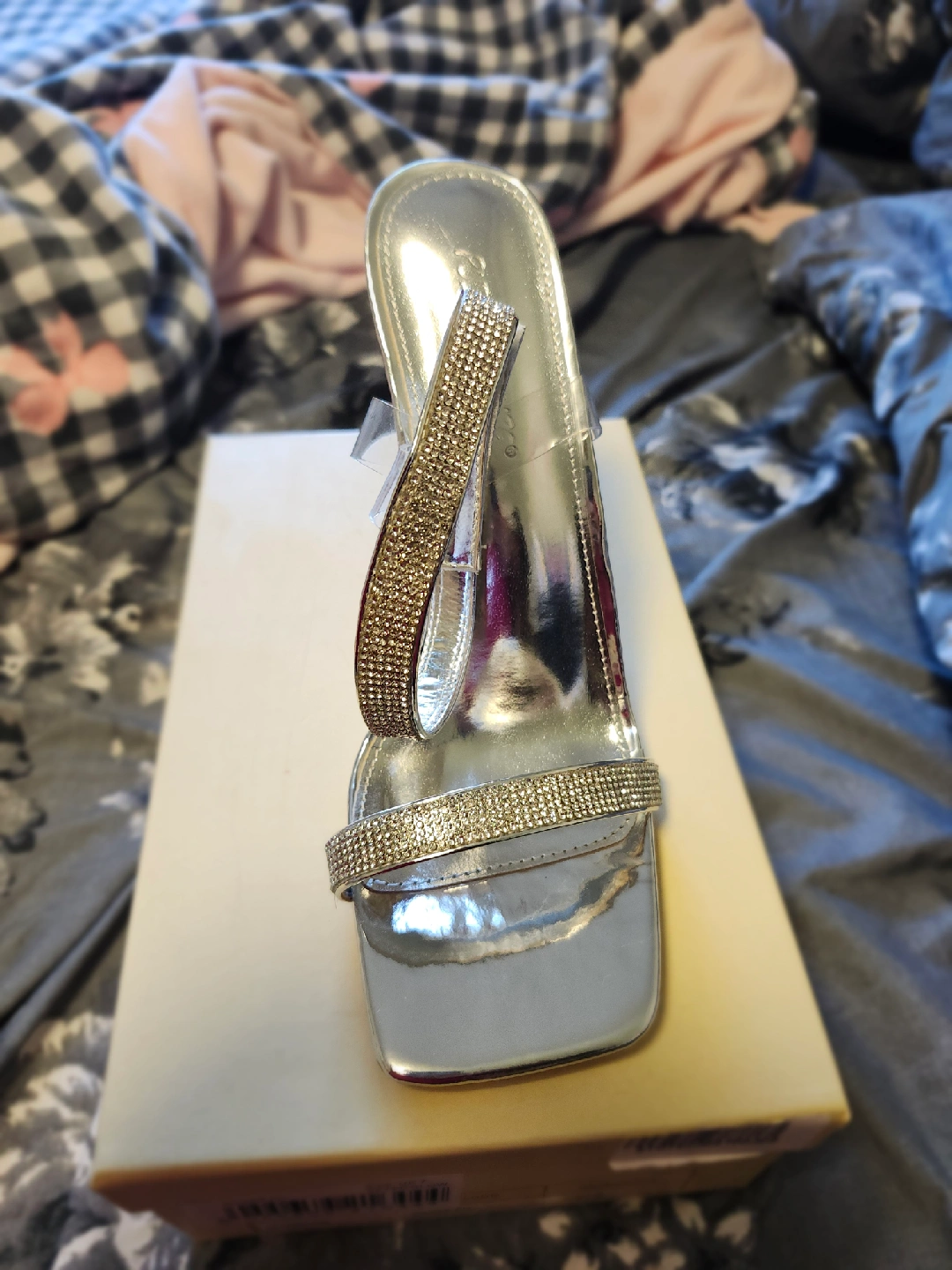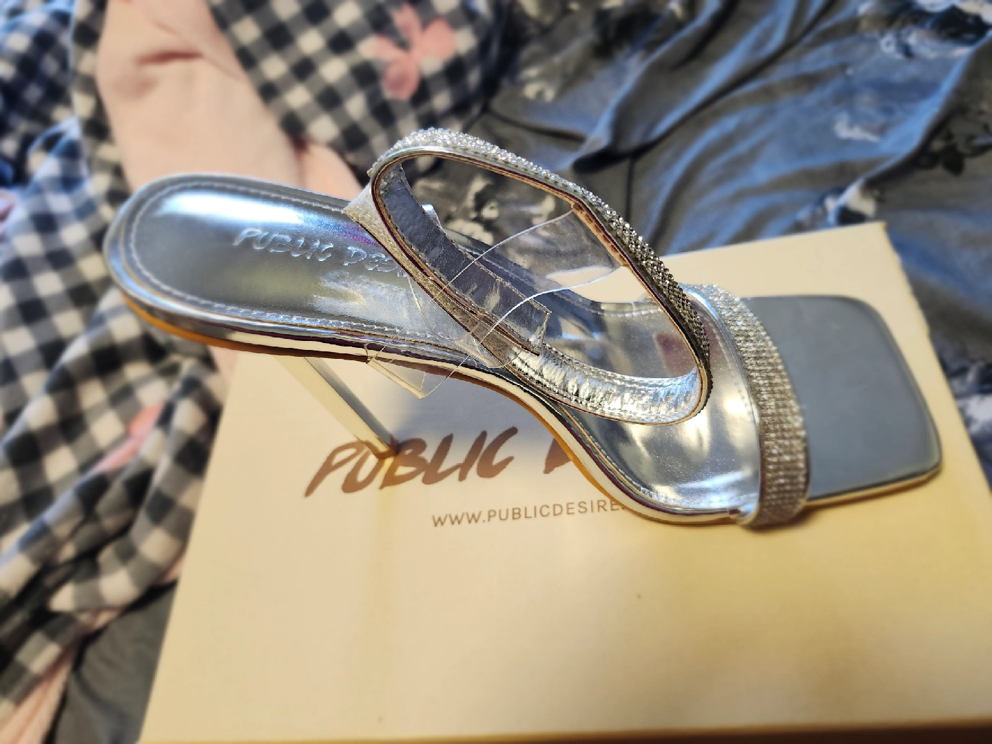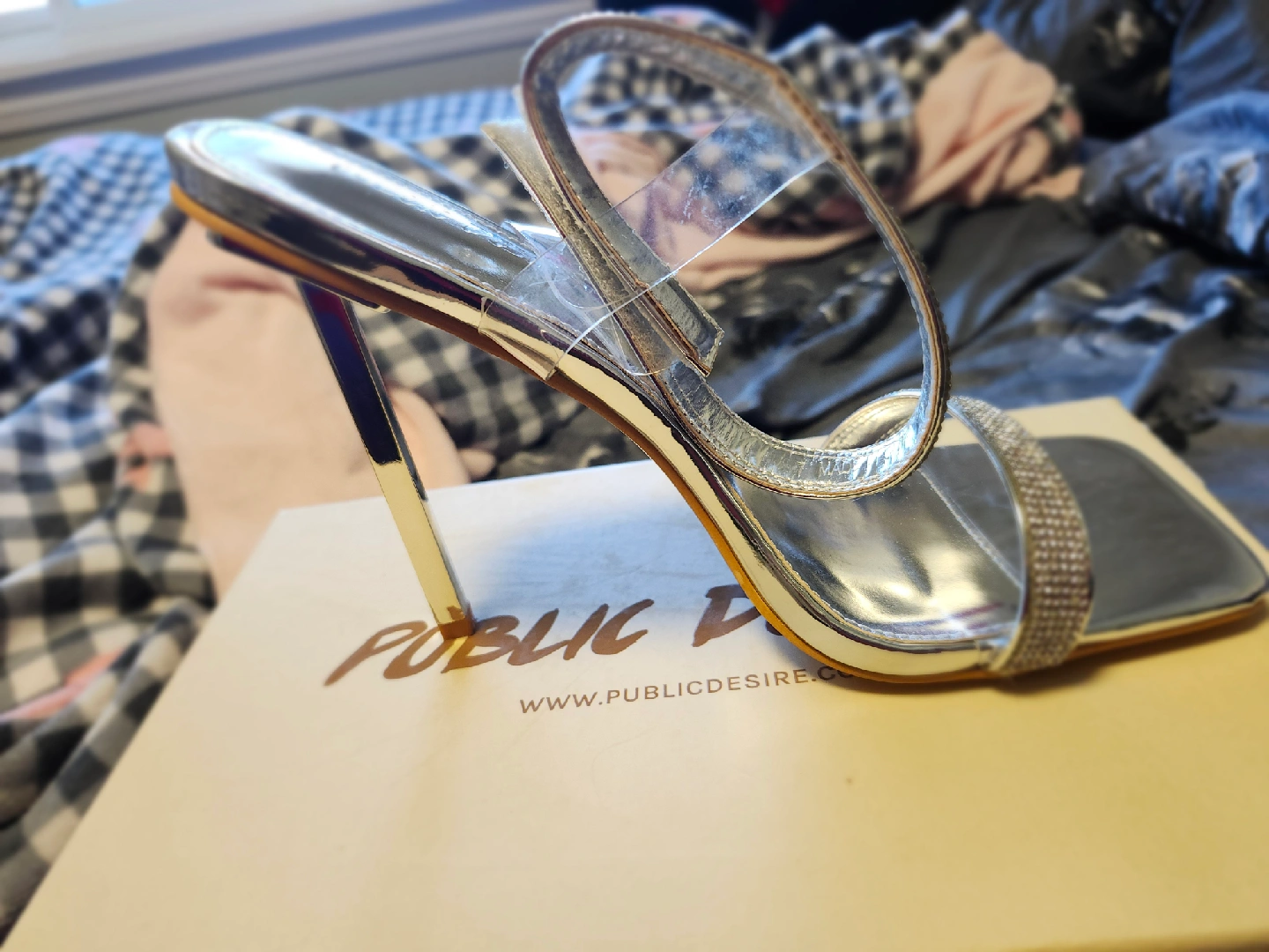 These brand new Public Desire silver heels are in excellent condition and come with the original box! They're a size 7 and feature sparkly detailing on the straps. Perfect for a night out or special occasion!