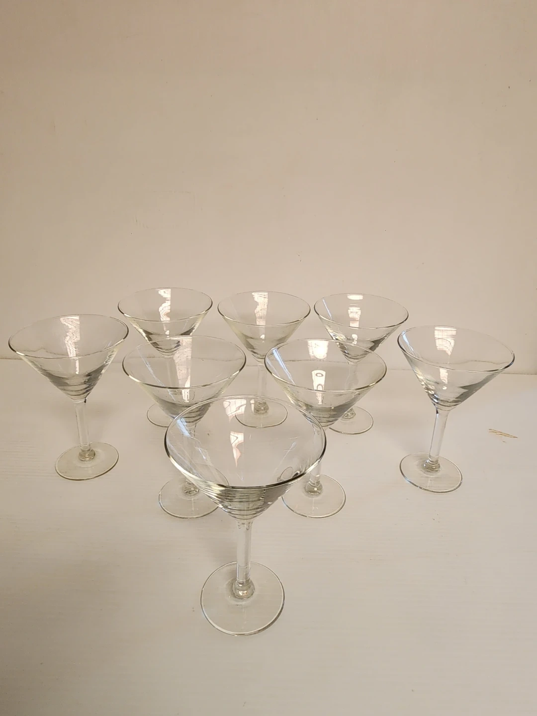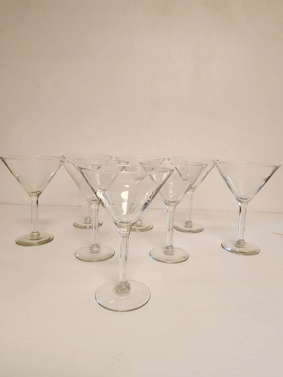 This is a set of 8 clear glass martini glasses. They're great for serving cocktails at parties or gatherings. Made of durable glass.