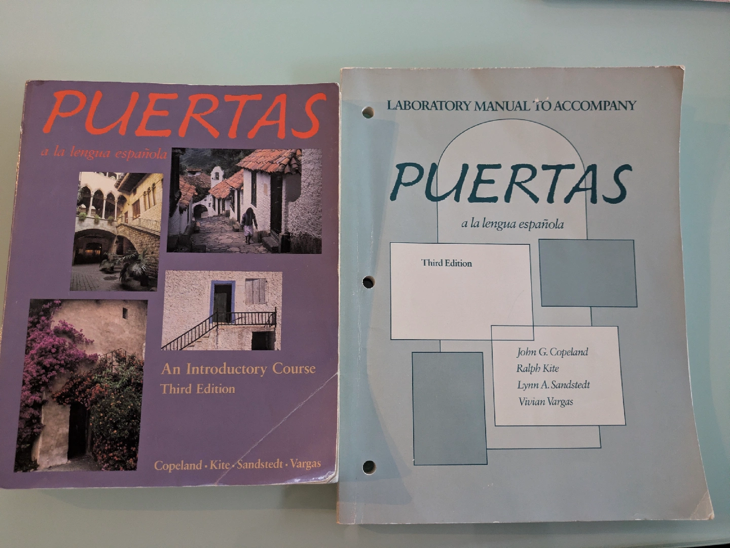 Previously used as Spanish 100. university level. Selling a set of 'Puertas a la lengua española' textbooks. Includes the main textbook (Third Edition) and the accompanying laboratory manual. Both are in used condition and ready for a new student!