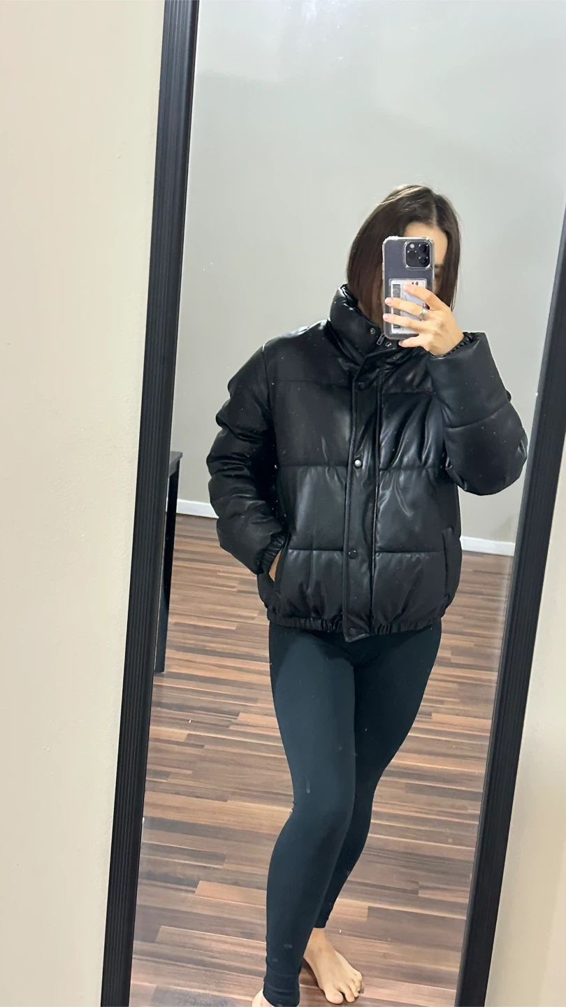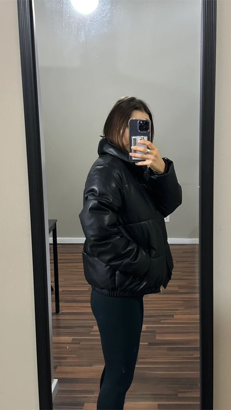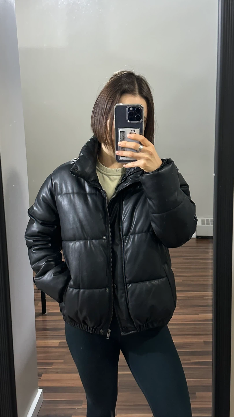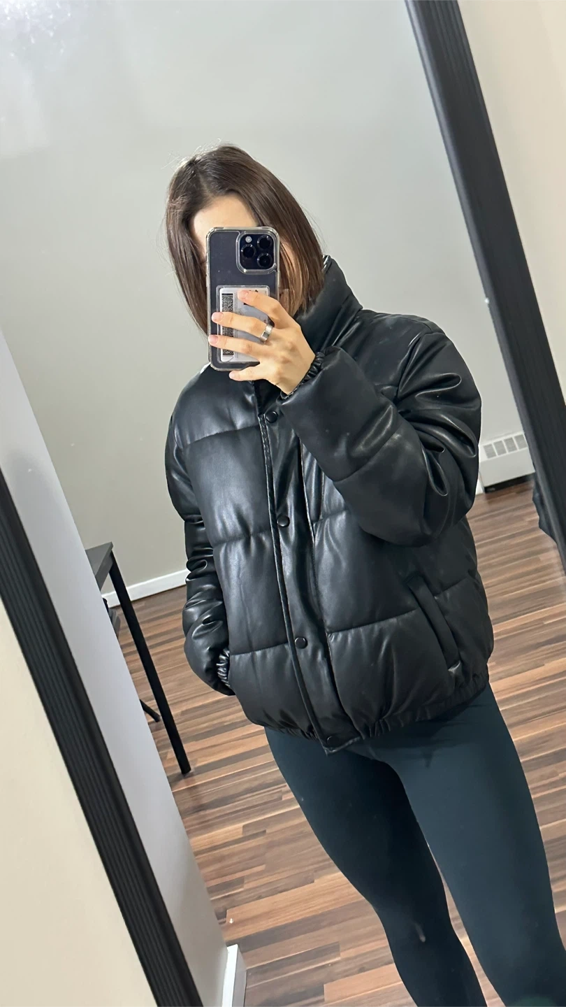 60Selling a black Puff Puffer jacket! It's in great condition and perfect for the colder weather. The material is a sleek, faux leather.