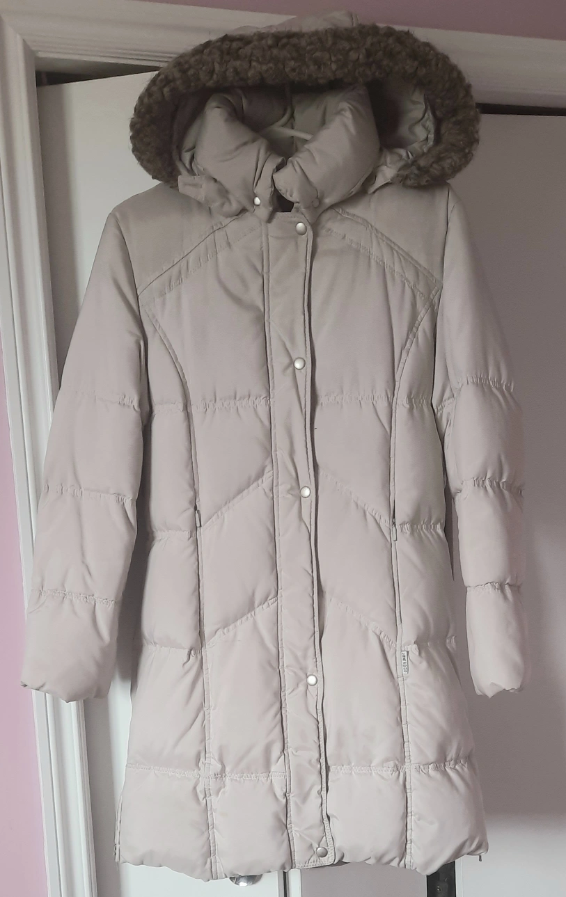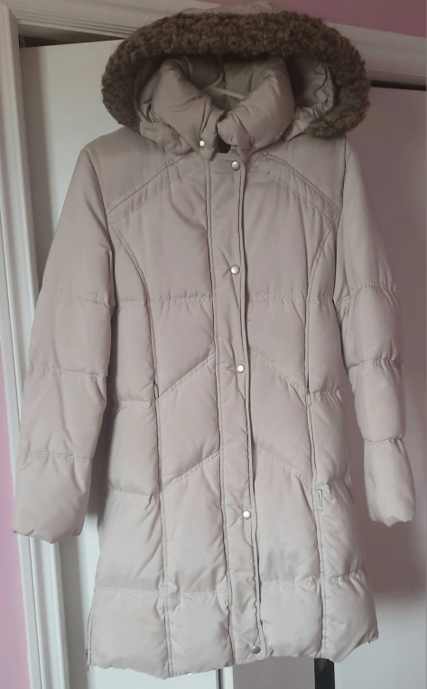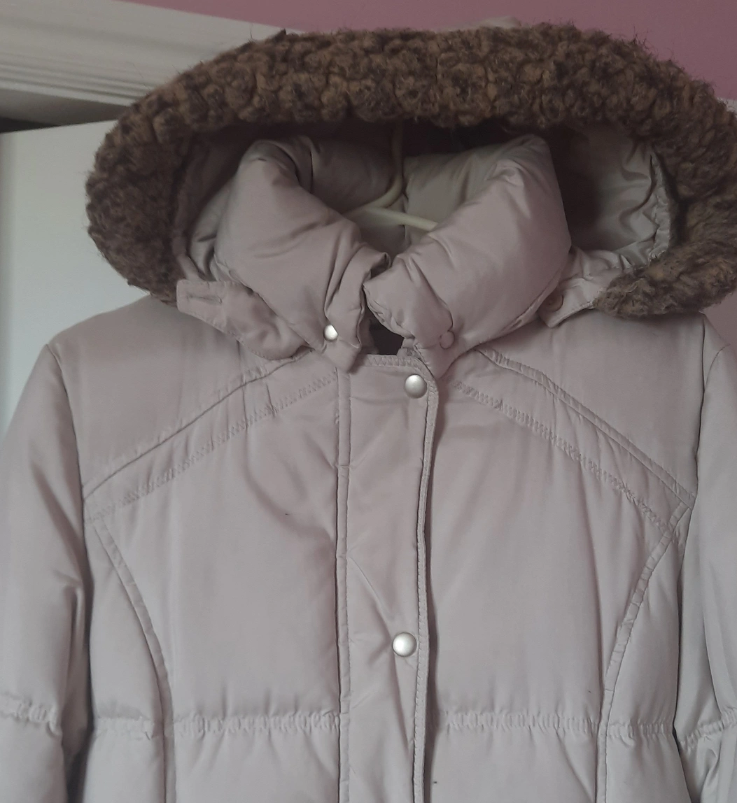 Here's a lovely puffer coat in a neutral colour, perfect for the colder months! It features a stylish faux fur hood to keep you extra cozy. The coat is in great condition and ready for a new home