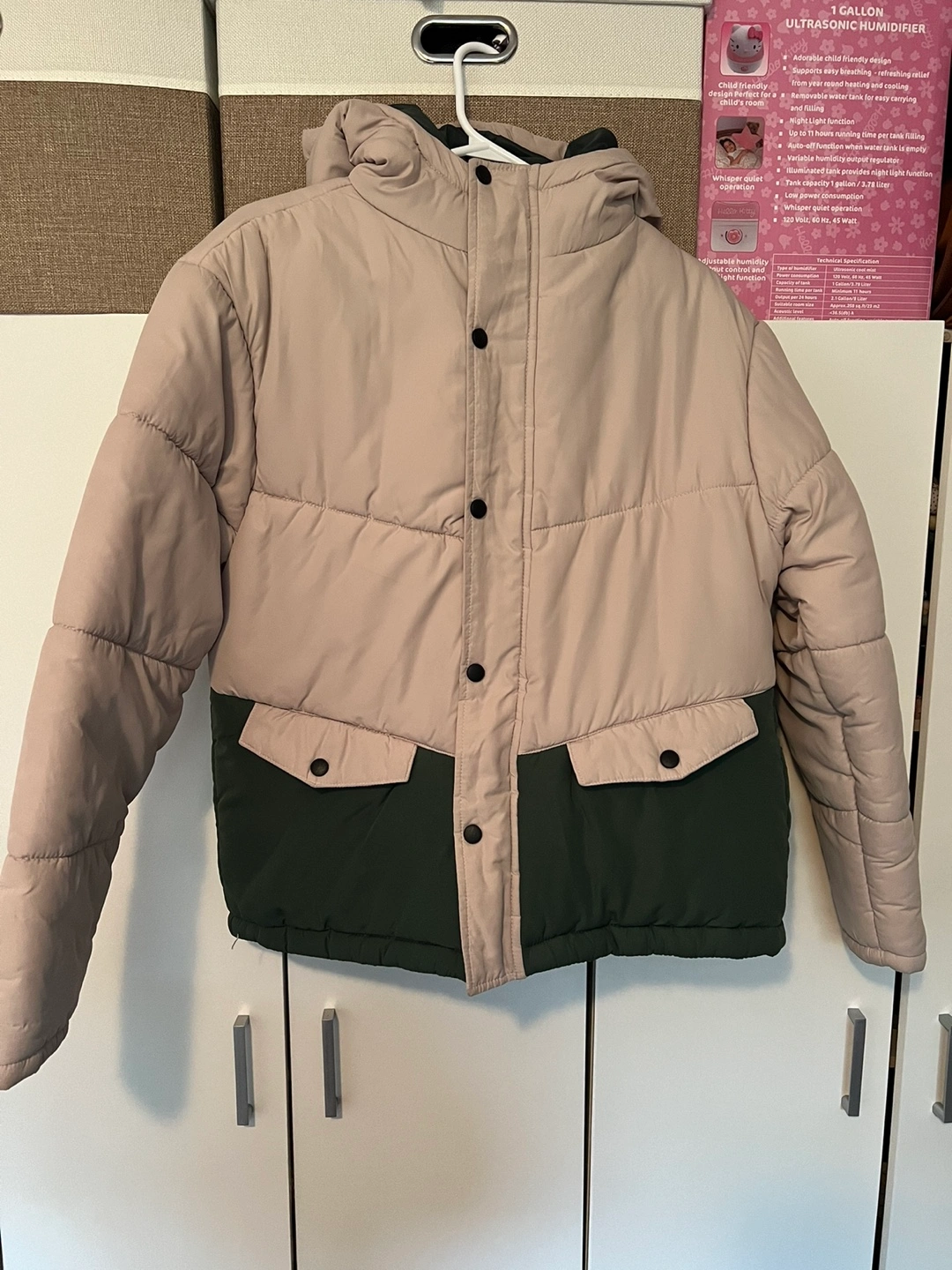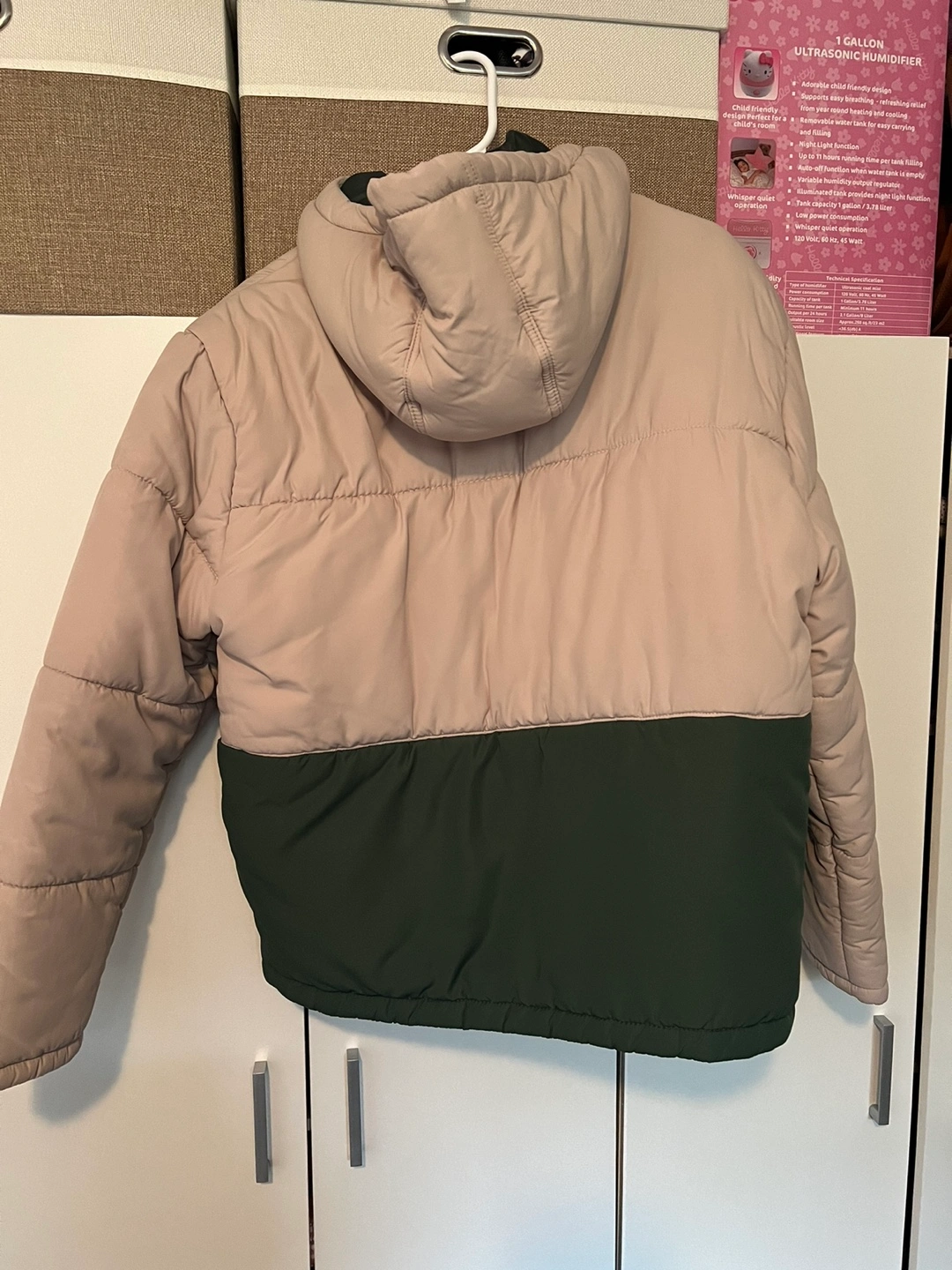 Green and beige puffer jacket with hood, size medium. Two pockets on the front. In excellent condition.