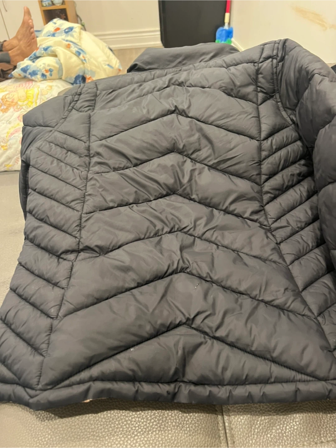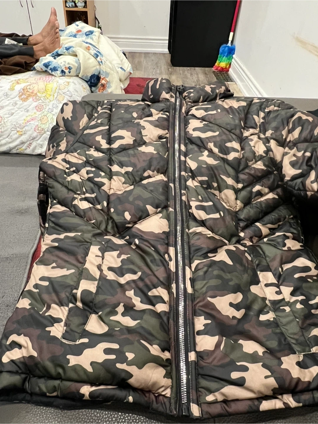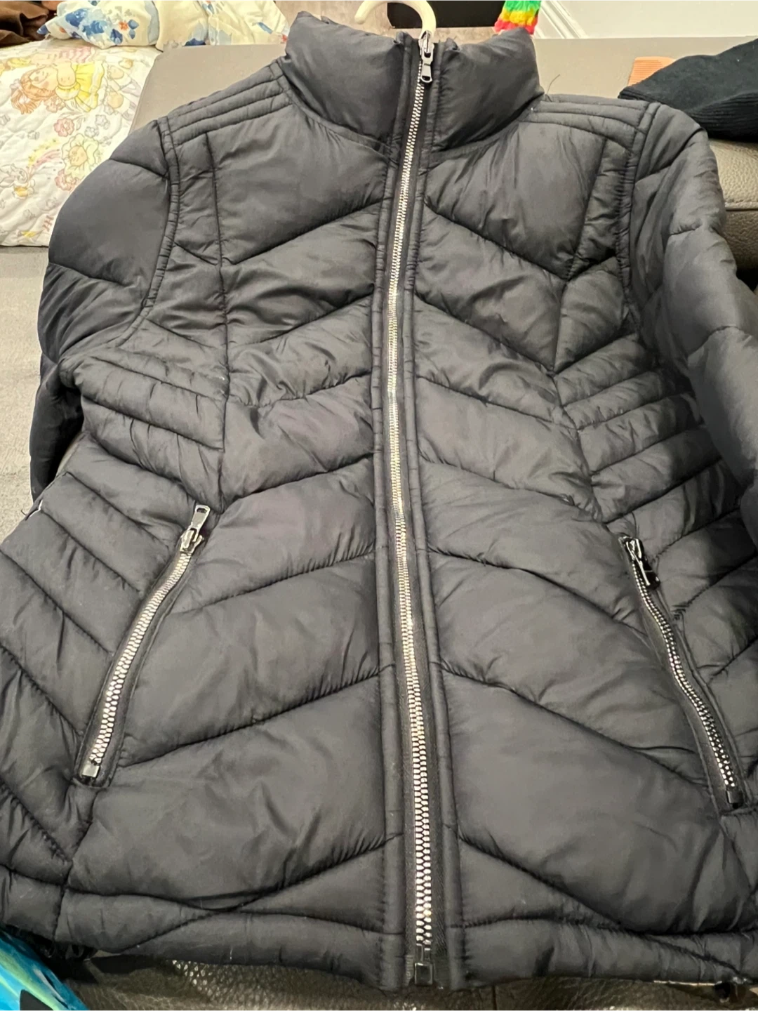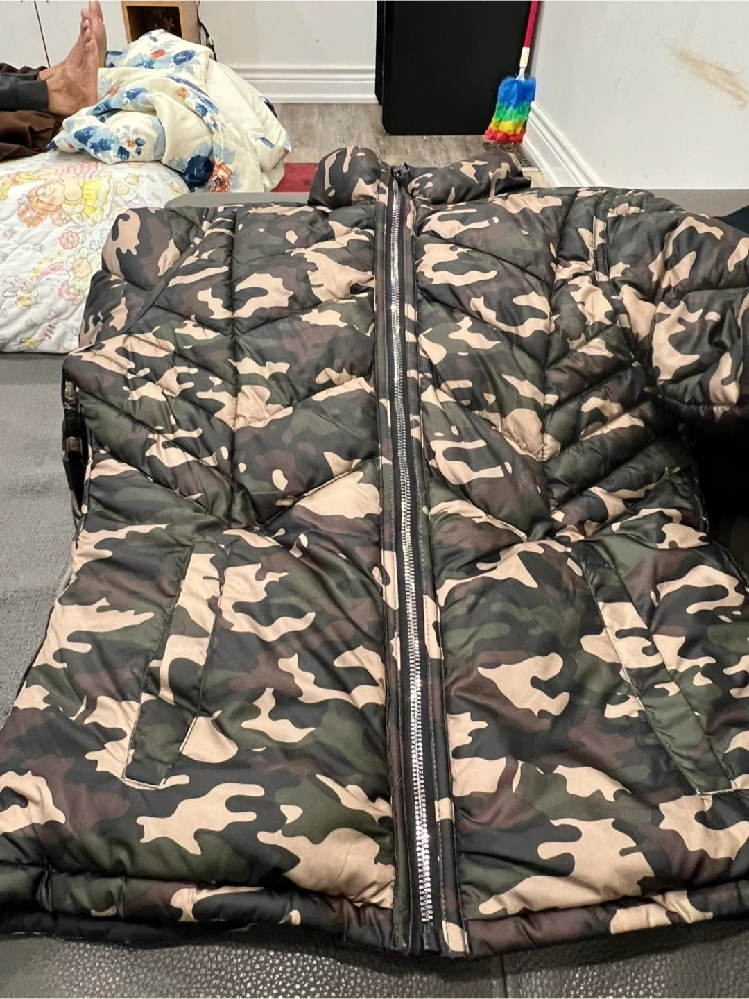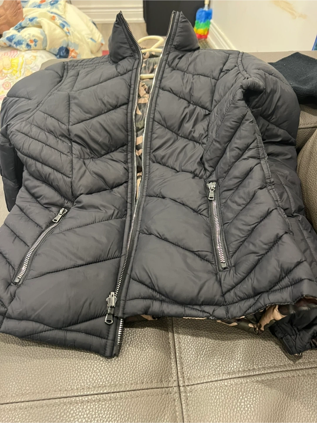 66Selling a black puffer jacket it’s super warm and it’s a reversible you can wear it at both side. One side is army pattern. The other one is black whatever side do you like you can wear it it’s very beautiful and always new.