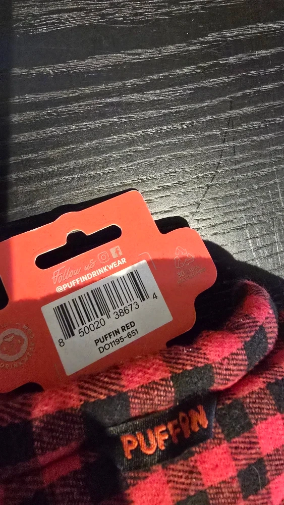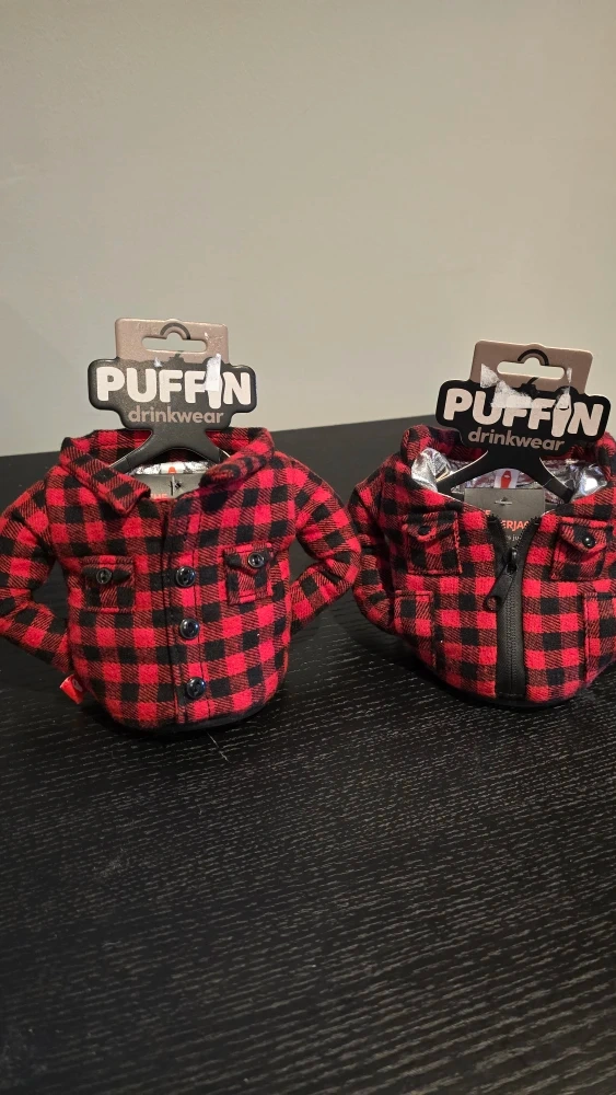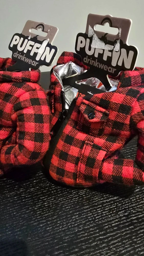 60Selling as a pair. $25.00 for both. Keep your drinks cozy with this Puffin Drinkwear Lumberjack beverage holder! It's in a classic red and black plaid pattern, perfect for keeping your drinks insulated and stylish. They are paired together