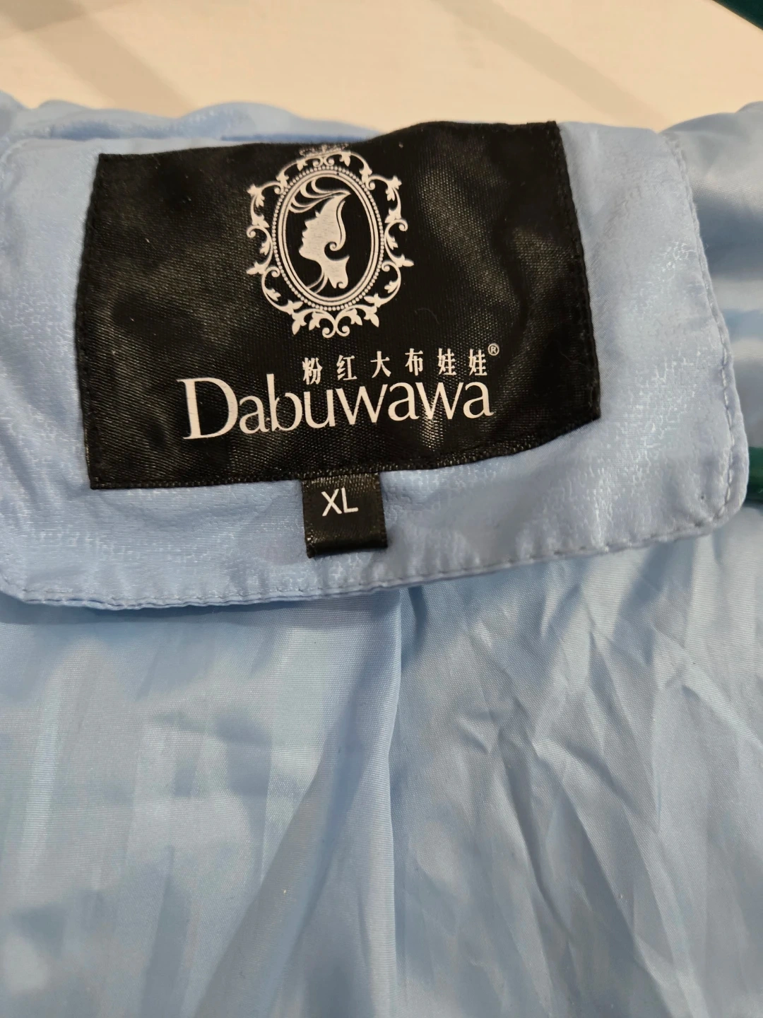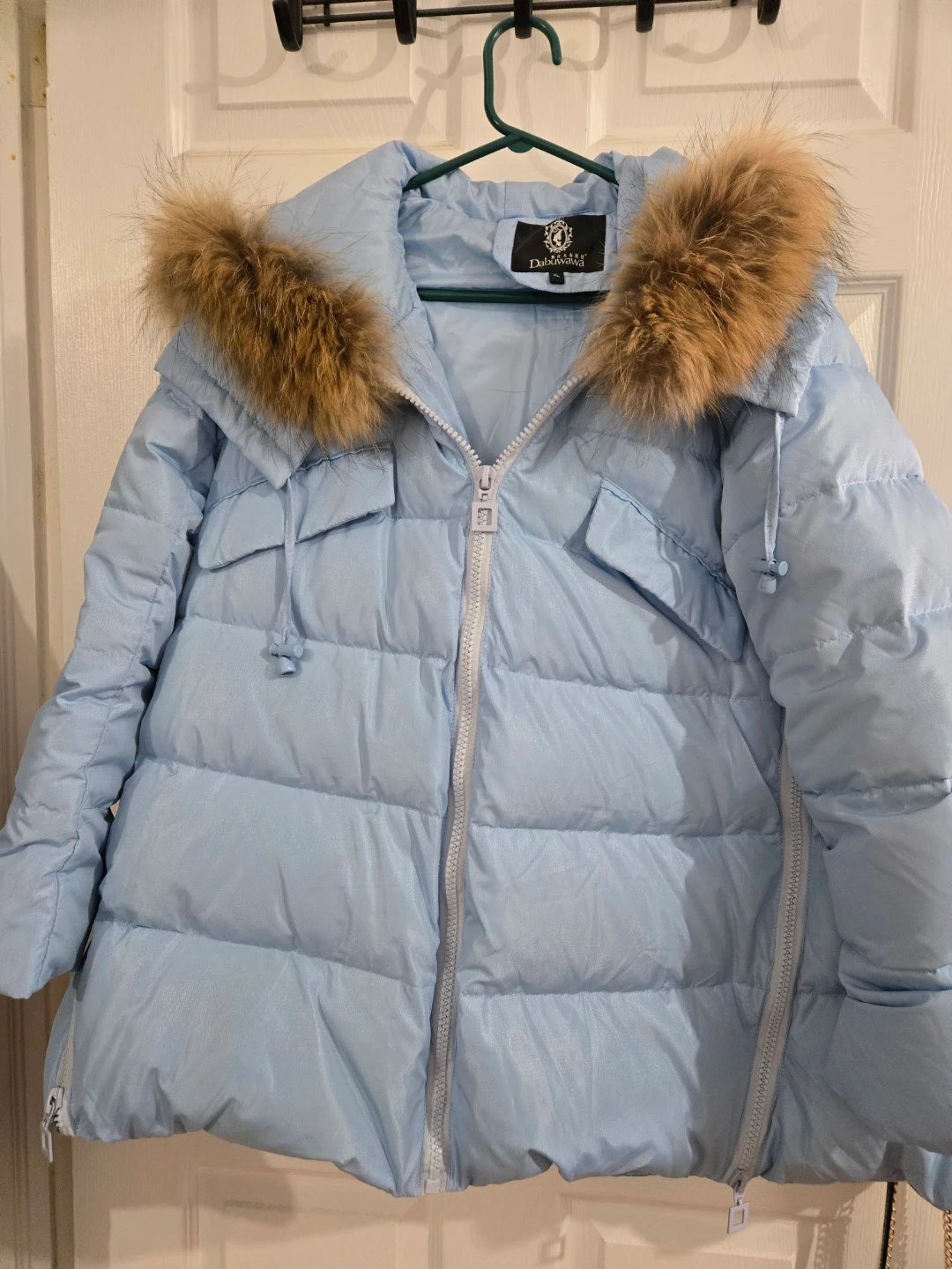 Stay warm in this stylish light blue puffer jacket from Dabuwawa. It features a cozy fur-lined hood and a size XL fit. This jacket is great for chilly winter days!