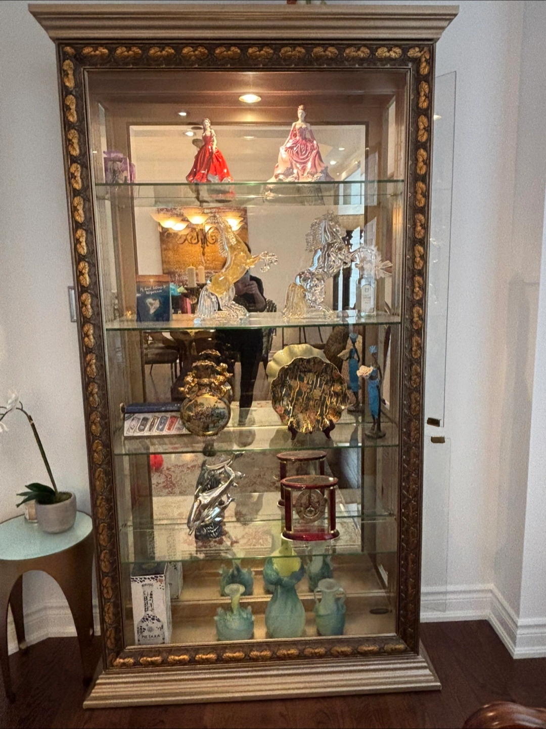 Pulaski High End display cabinet with glass shelves. It's in great condition and ready to showcase your collectibles or favourite items! It has a gold-coloured frame. Has lighting and Glass opens from each side.