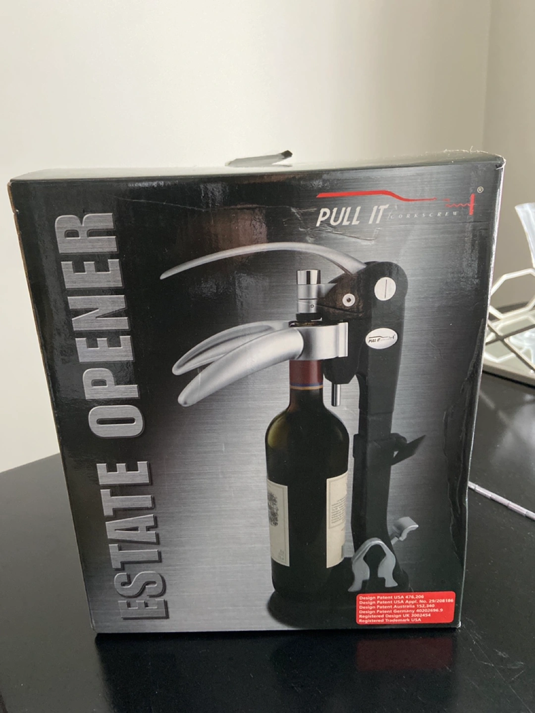 New in box Pull-It Estate Opener corkscrew. Features a sleek design. Perfect for wine enthusiasts.
