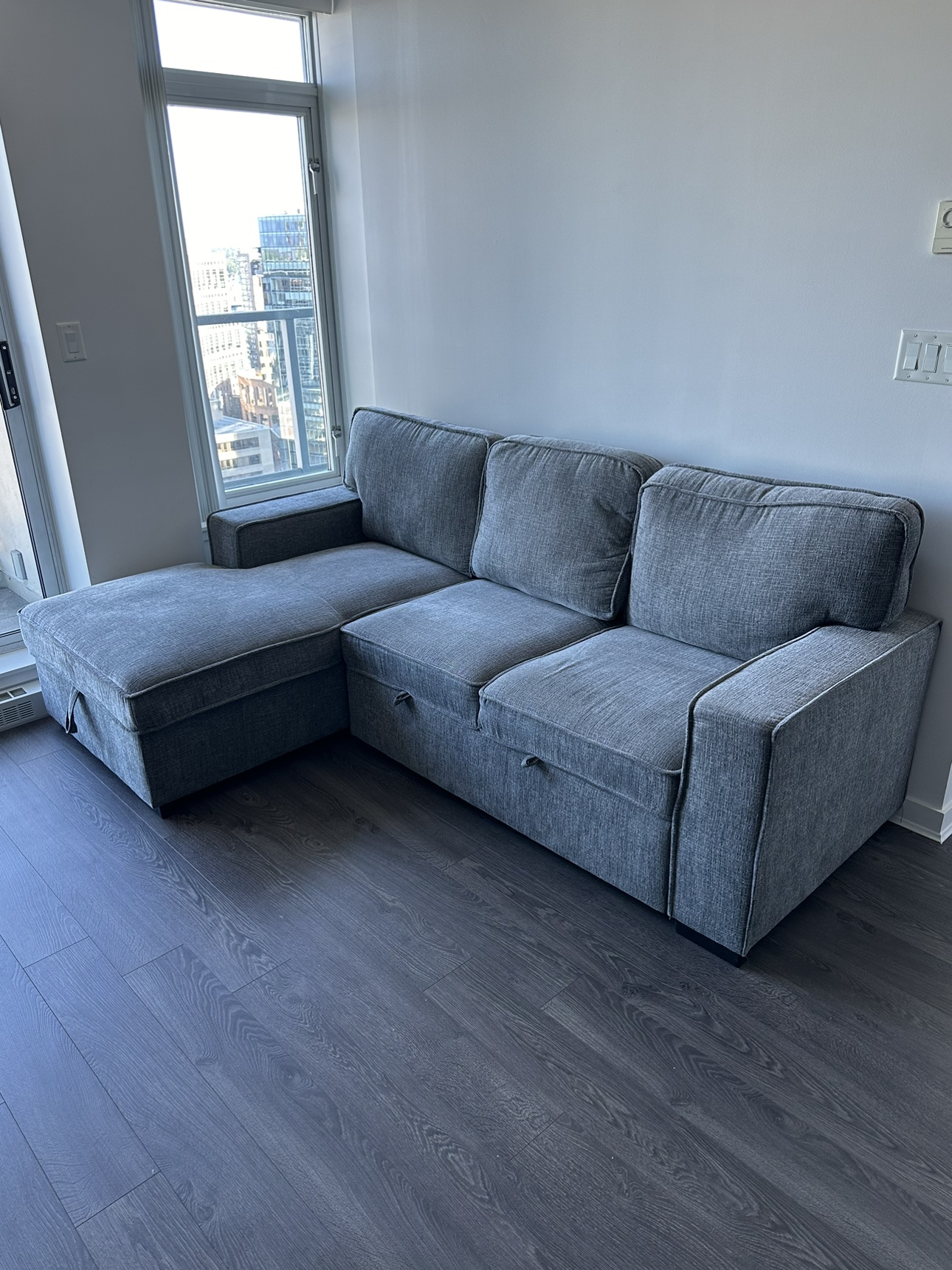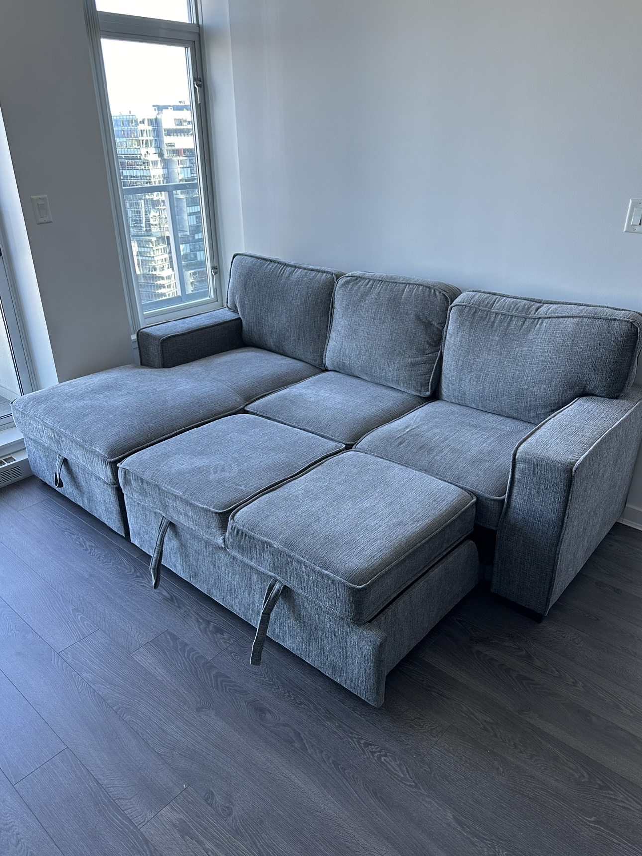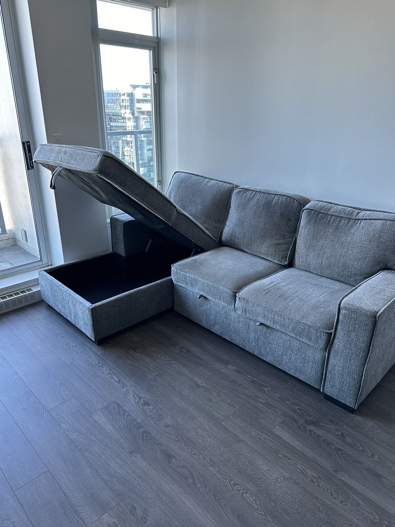 17!!!Can deliver on June 30th within Vancouver!!! Malibu L shape couch with pullout and storage. Purchased new June 2023. Been in a smoke free and pet free house. Dimensions: W - 94in Depth - 34in Depth of pullout and Lshape - 60in