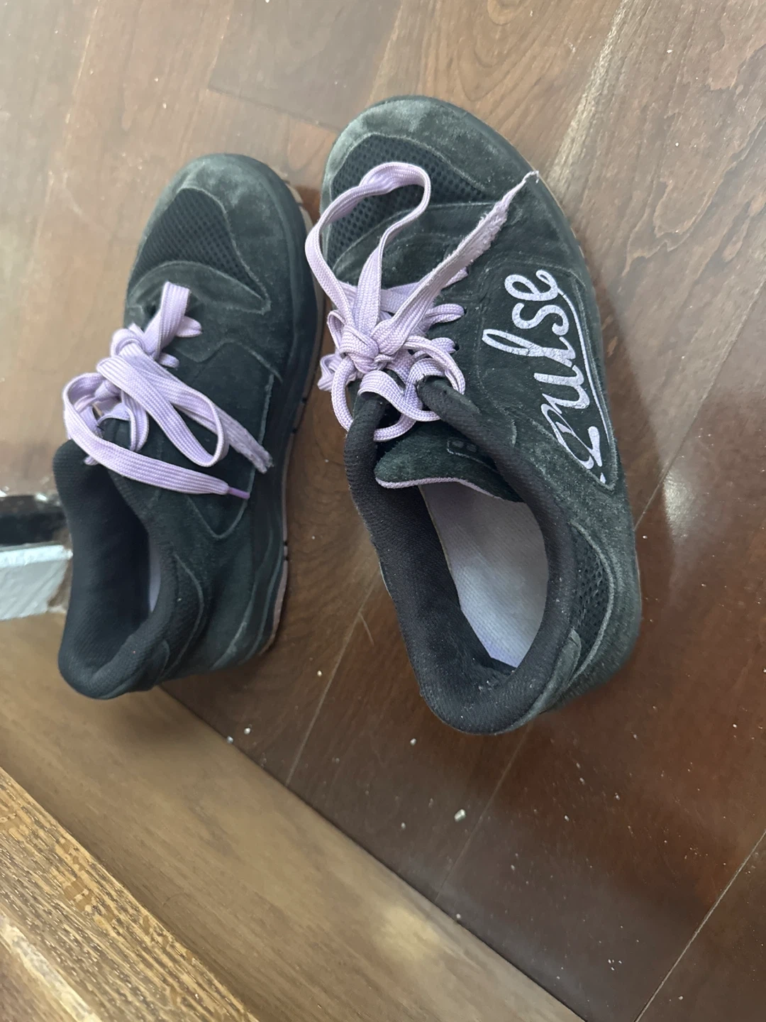 918Selling a pair of black running shoes with purple laces. They have the word "Pulse" written on the side. Good for running or casual wear