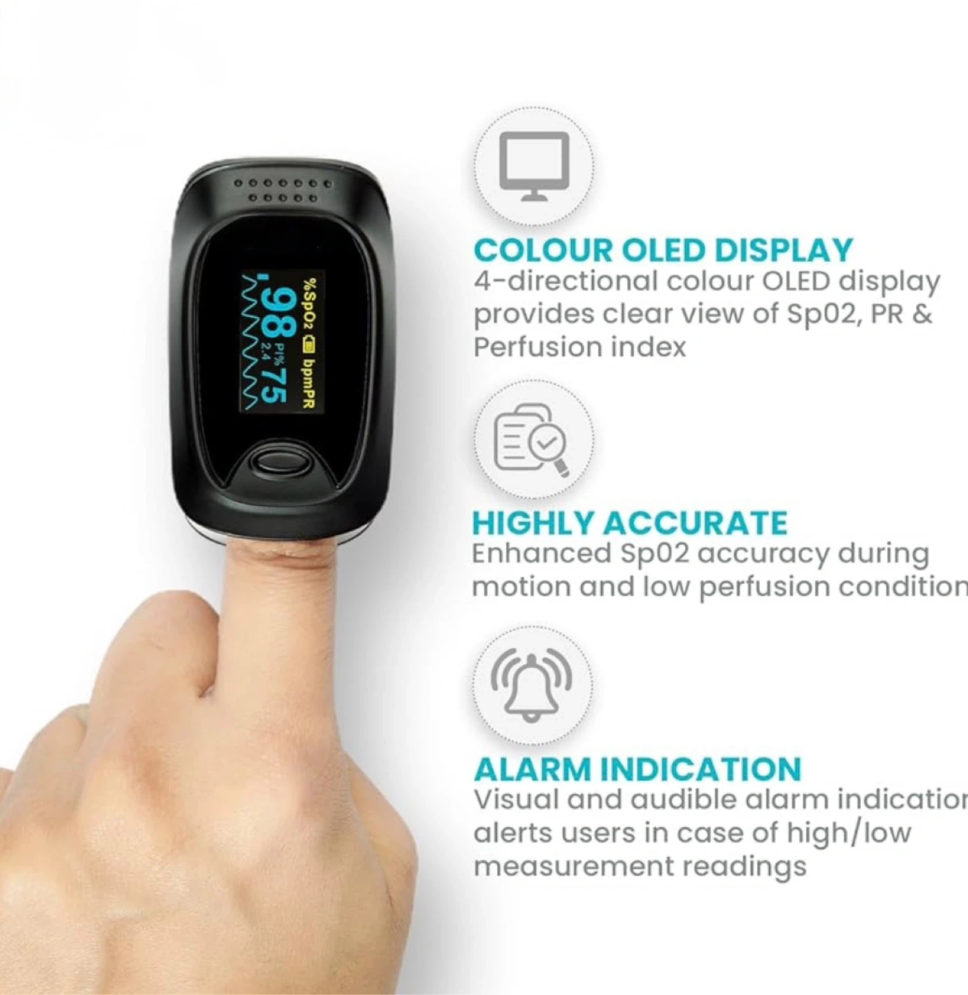 Selling a SmartOxy pulse oximeter. It features a colour OLED display for clear readings of SpO2, PR, and Perfusion index. It's also highly accurate, even during motion and low perfusion conditions. The visual and audible alarm indicates high or low measurement readings. It has a compact design suitable for a wide range of finger sizes and an auto shut-off function to enhance battery life