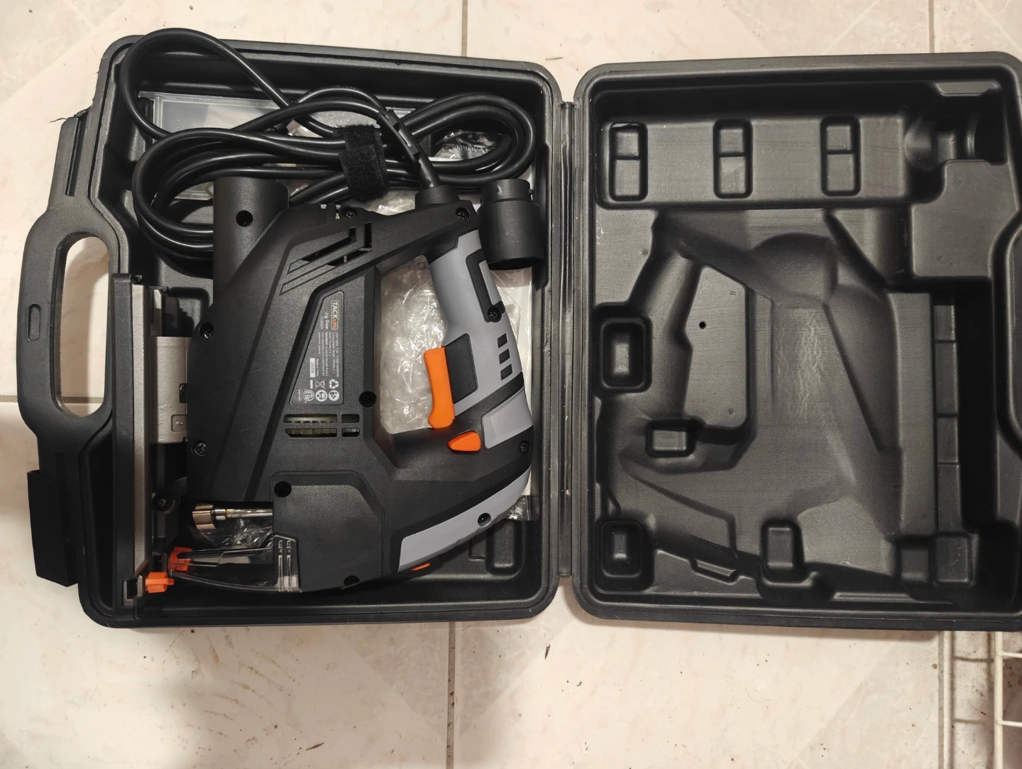 TACKLIFE jigsaw for cutting wood and other materials. Includes a durable carrying case. Blade is included and ready for use.