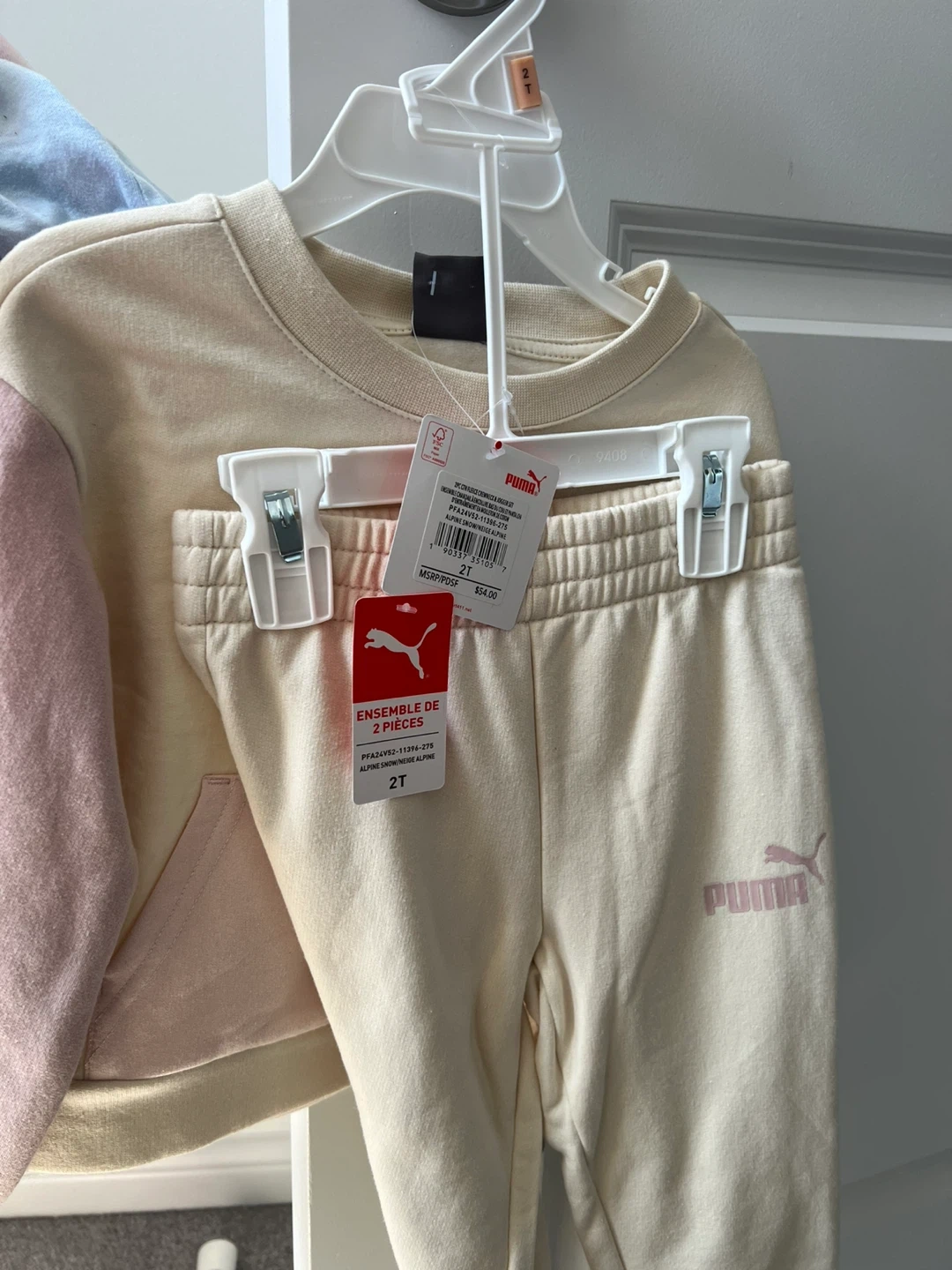 Super cute Puma two-piece outfit in size 2T! The set includes a sweatshirt and pants, perfect for your little one. The tag shows it originally retailed for $54.00!