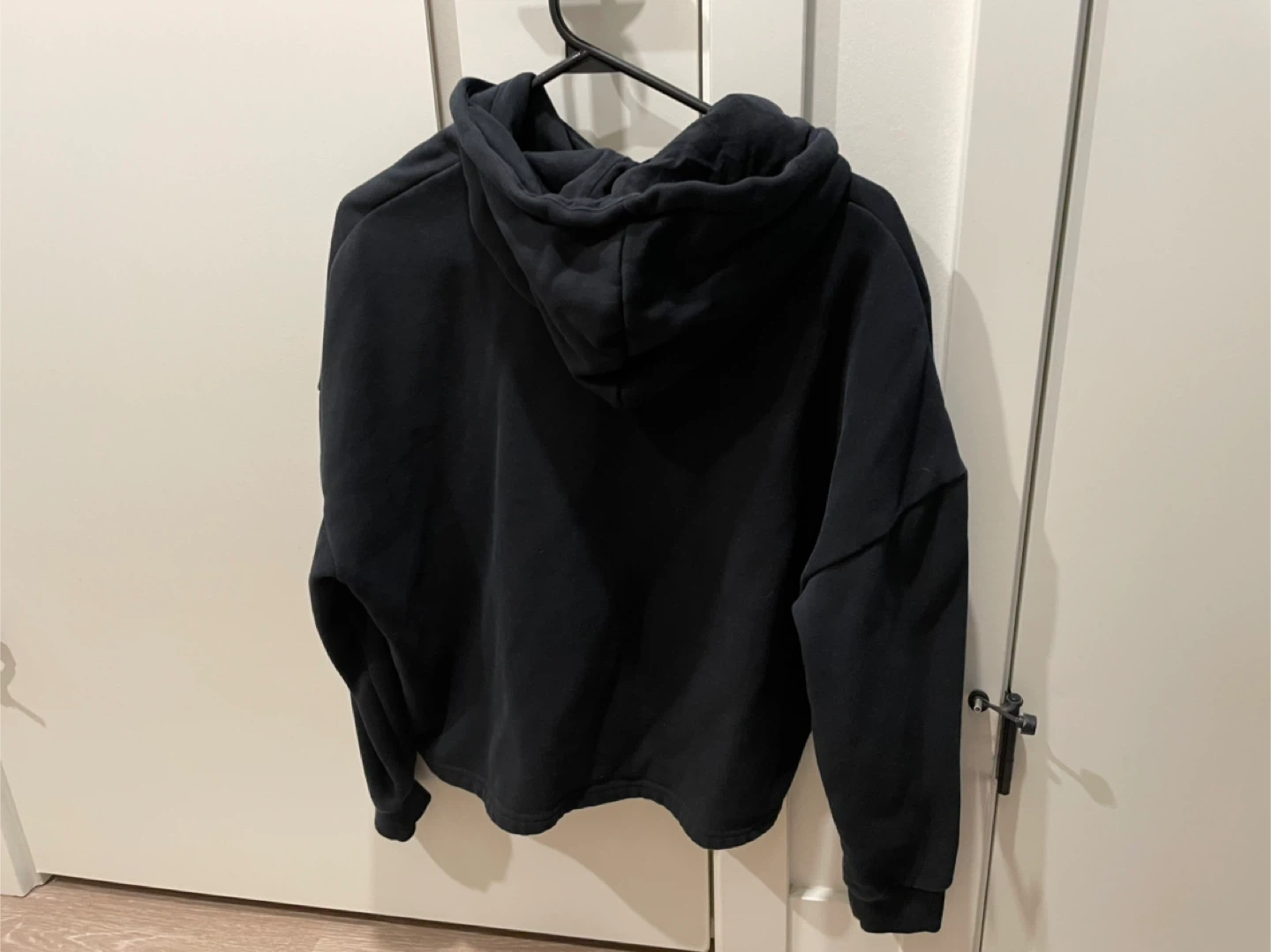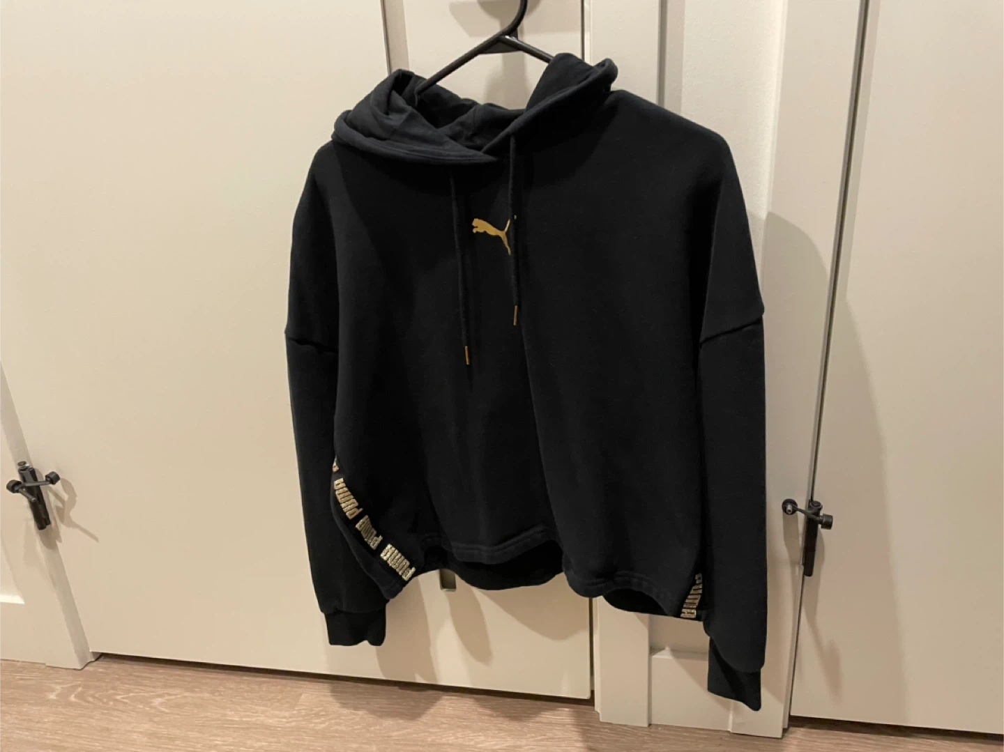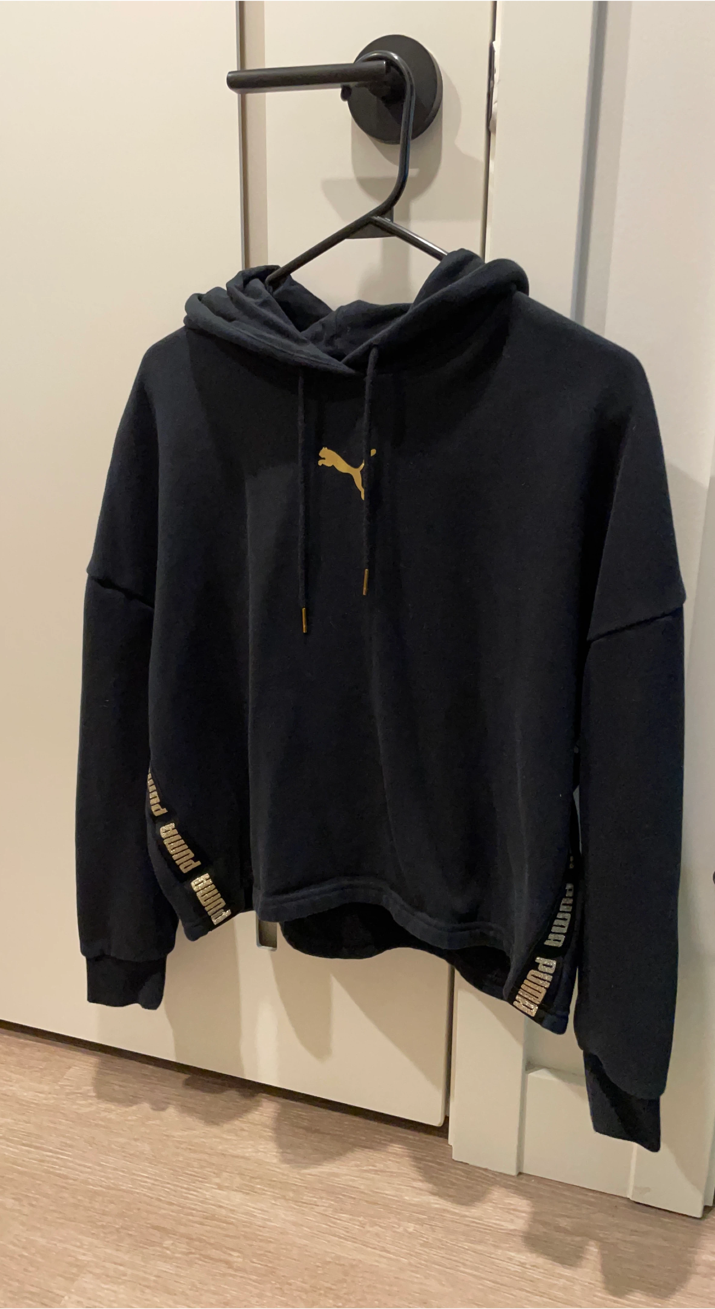 65Selling a comfy black cropped Puma hoodie. It features the Puma logo in gold on the front and Puma branding along the sides. Great for casual wear!