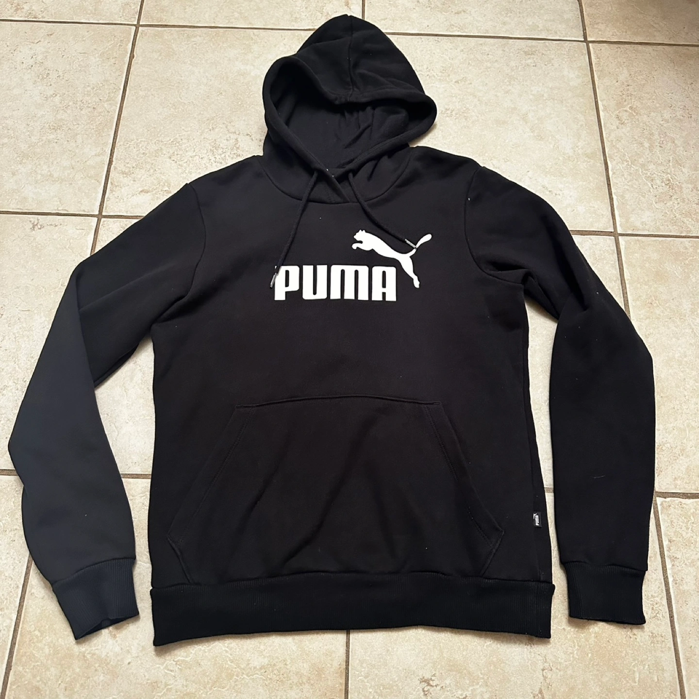 399Women’s black Puma hoodie. Size medium. Features a large Puma logo on the chest. Long sleeves, kangaroo pocket, drawstring hood. Brand new condition, barely worn