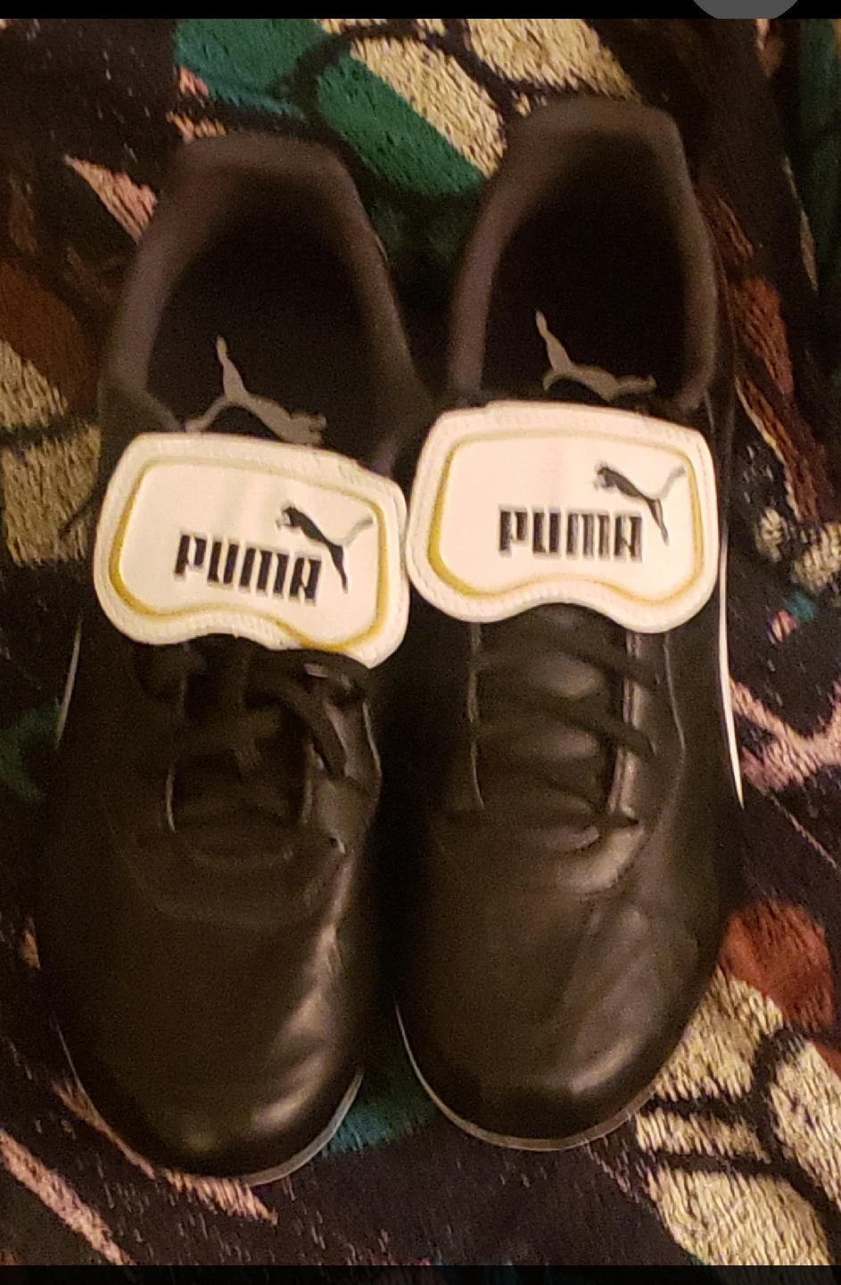 Selling a pair of black leather shoes from Puma. They feature the classic Puma logo on the tongue. These shoes are in great condition and ready for a new home!