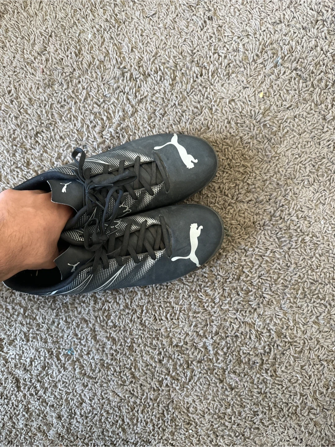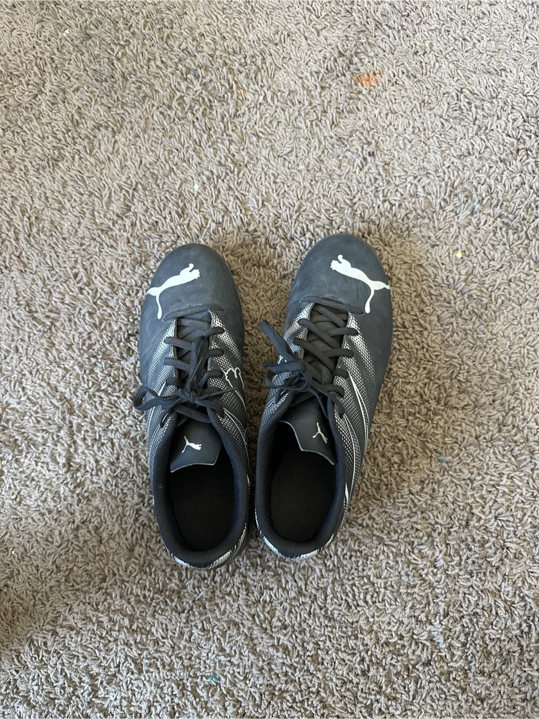 5Selling a pair of Puma soccer cleats in black. They show some signs of use but are still in good condition for playing on the field! They have black laces and the Puma logo on the side Size US 8.5