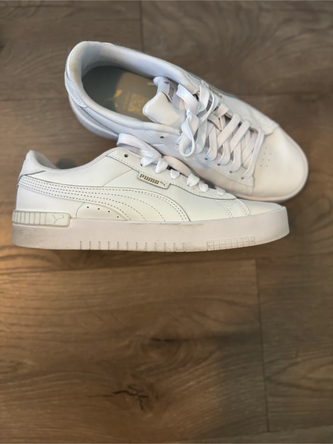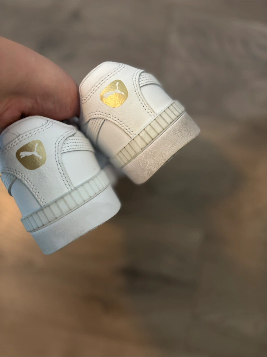 Selling a pair of Puma Cali Dream women's sneakers in size 10. They are white with the Puma logo in gold on the back. Some signs of wear on the soles, but otherwise in good condition! Fit more like a 9 and Only worn once!