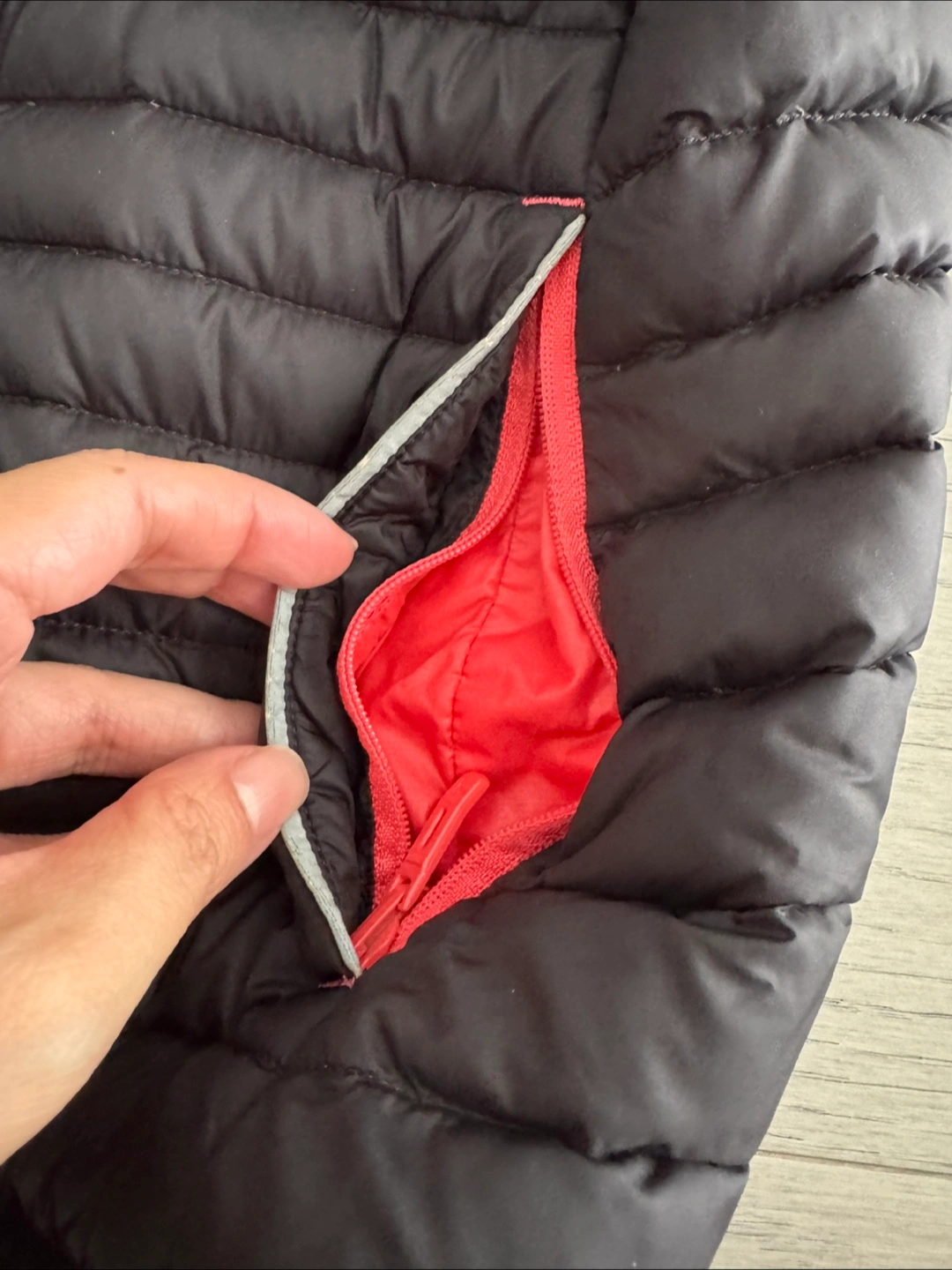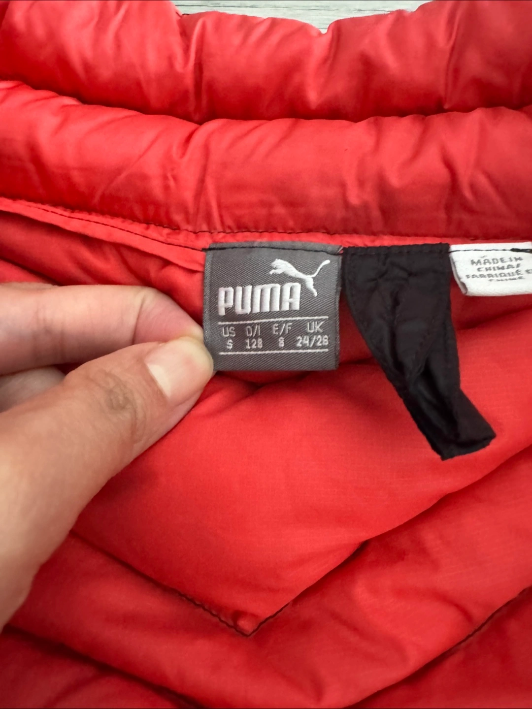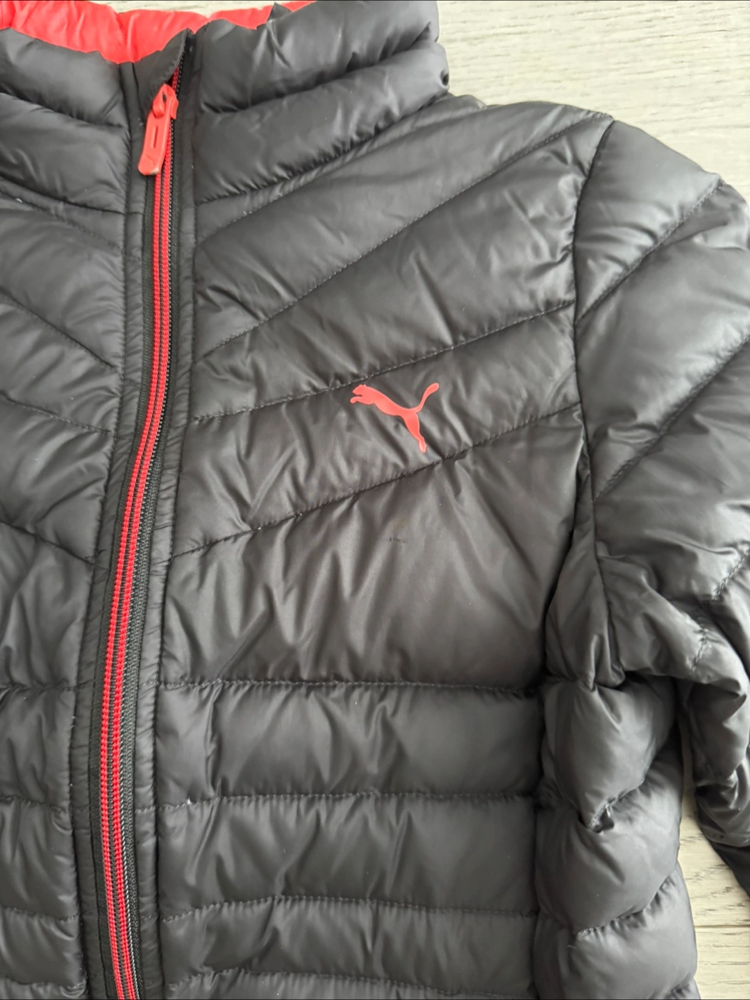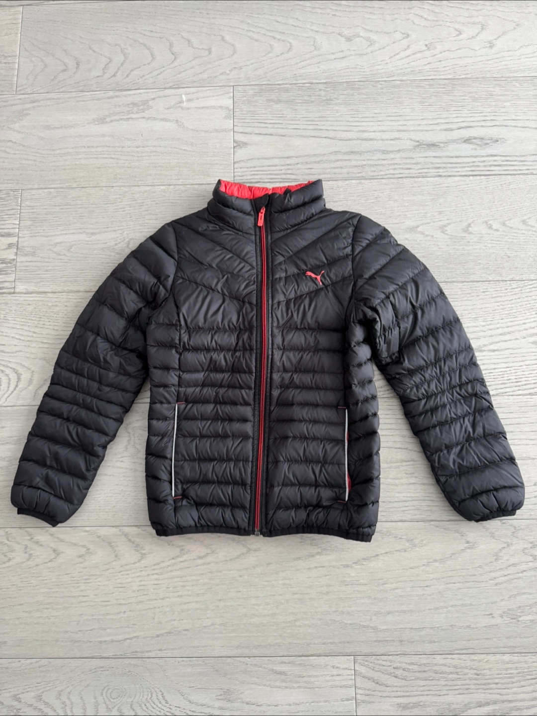 10Selling a gently used Puma down jacket in size small for kids 6-8 years. It's black with a red lining and a zipper. Perfect for cooler weather!