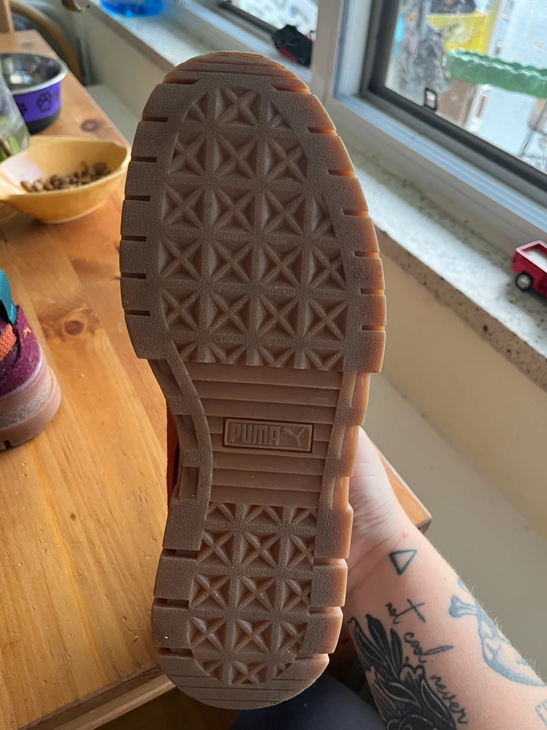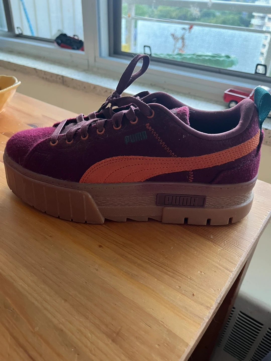 20Selling a pair of Puma Mayze Stack shoes in women's size 8! They have a cool, chunky platform sole and a stylish burgundy and orange colour combo. Perfect for adding a bit of edge to your everyday look