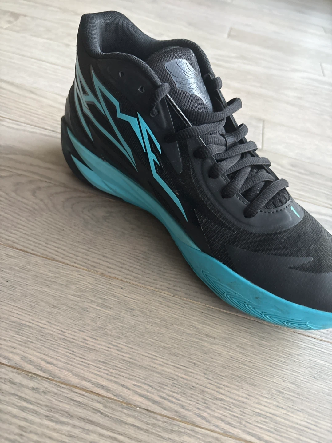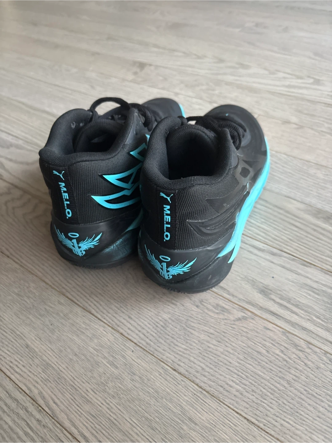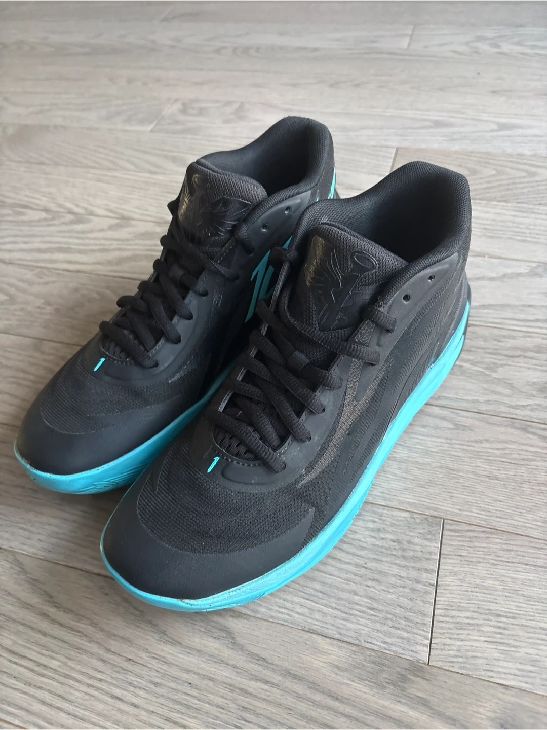Selling a pair of Puma MB.01 Melo basketball shoes in black and blue. They are in used condition, but still have lots of life left! Perfect for hitting the court or just rocking a stylish look used like new. No box