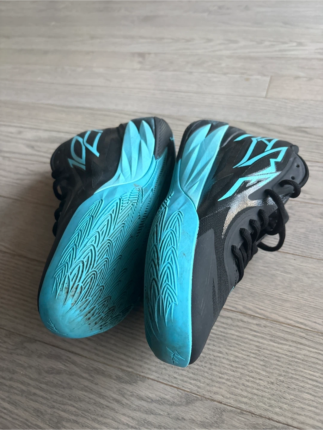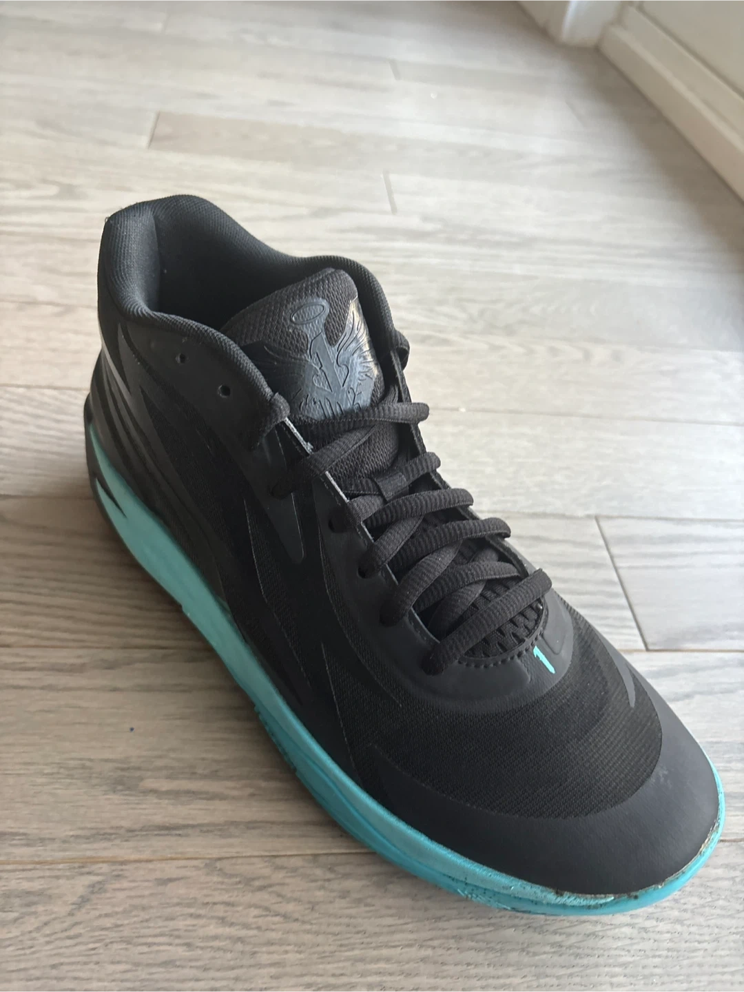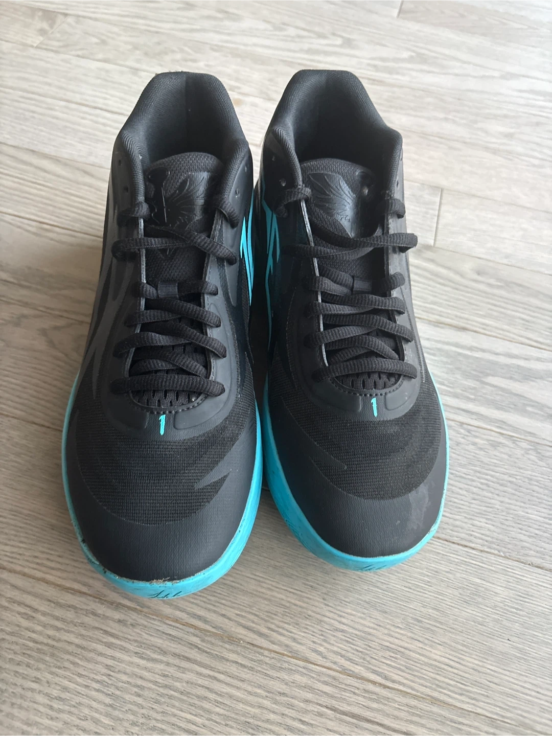 Selling a pair of Puma MB.01 Melo basketball shoes in black and blue. They are in used condition, but still have lots of life left! Perfect for hitting the court or just rocking a stylish look used like new. No box