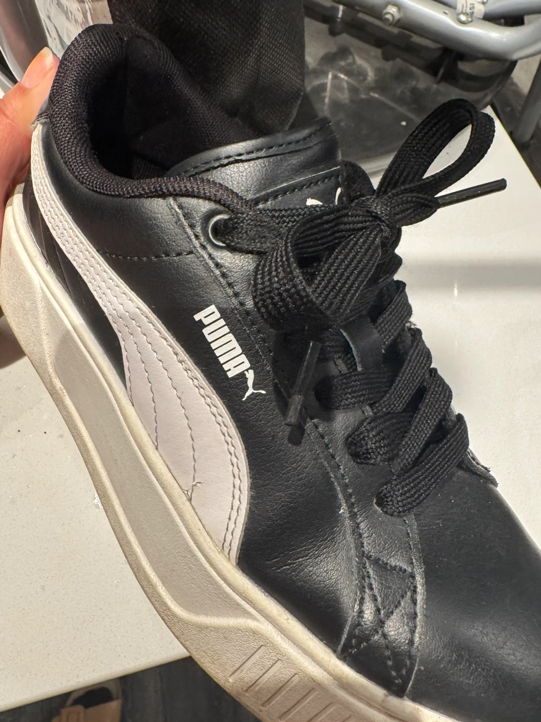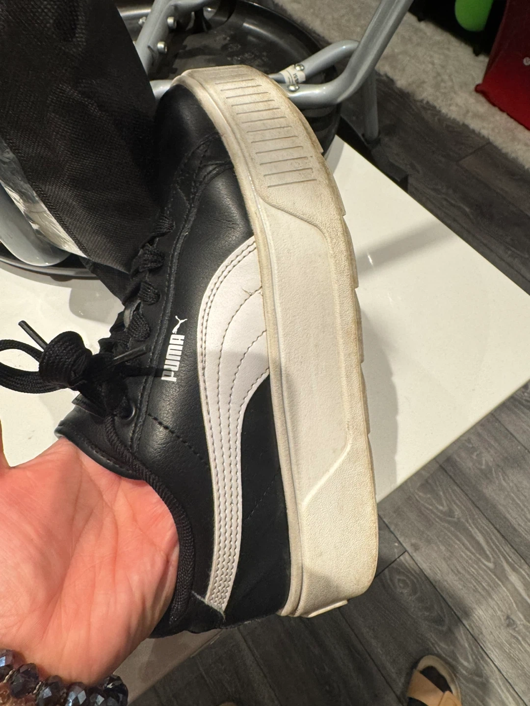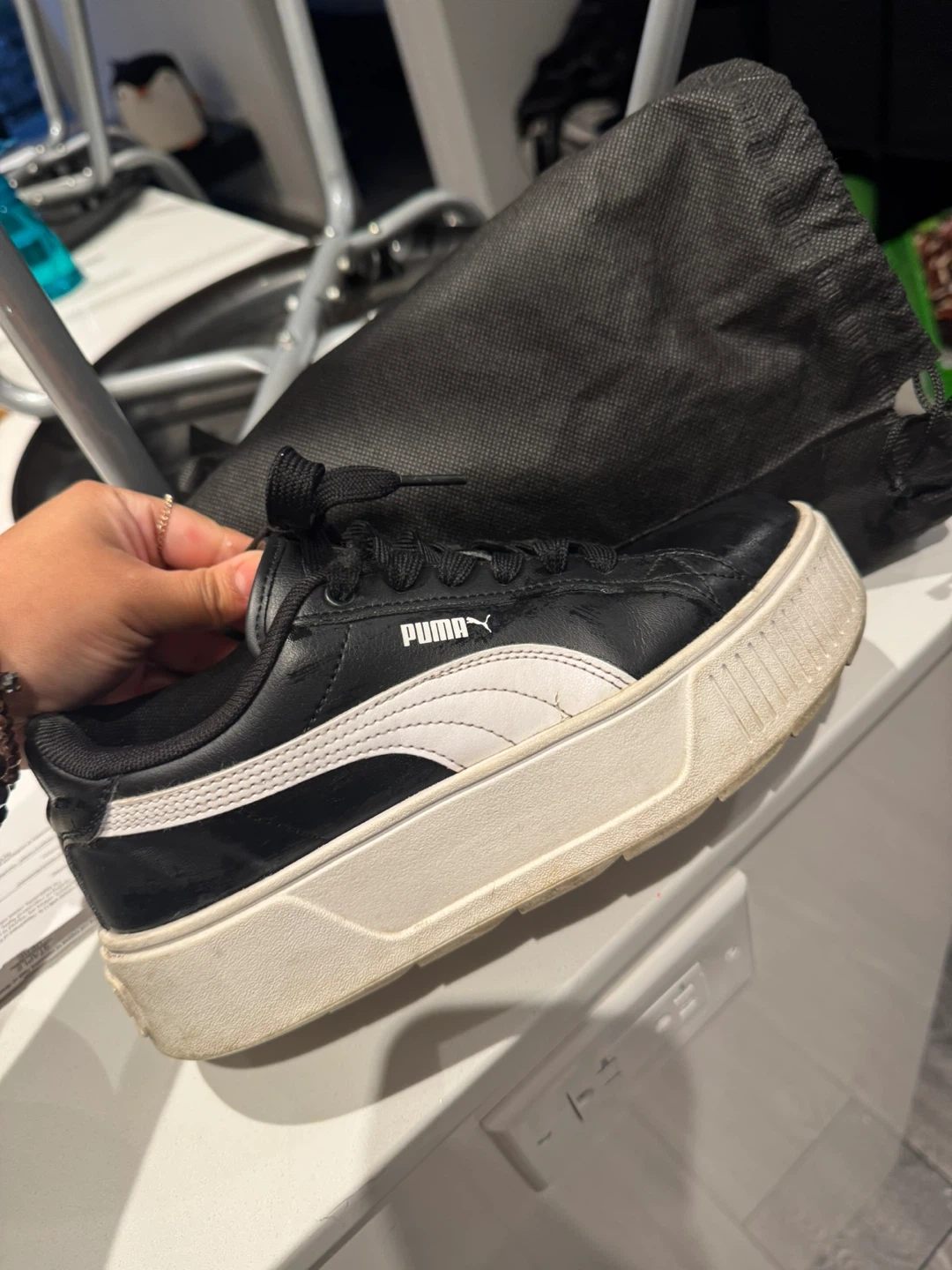 38Selling a pair of Puma platform sneakers in size 5. They are black with a white stripe and have a platform sole! They're in good condition and ready for a new home