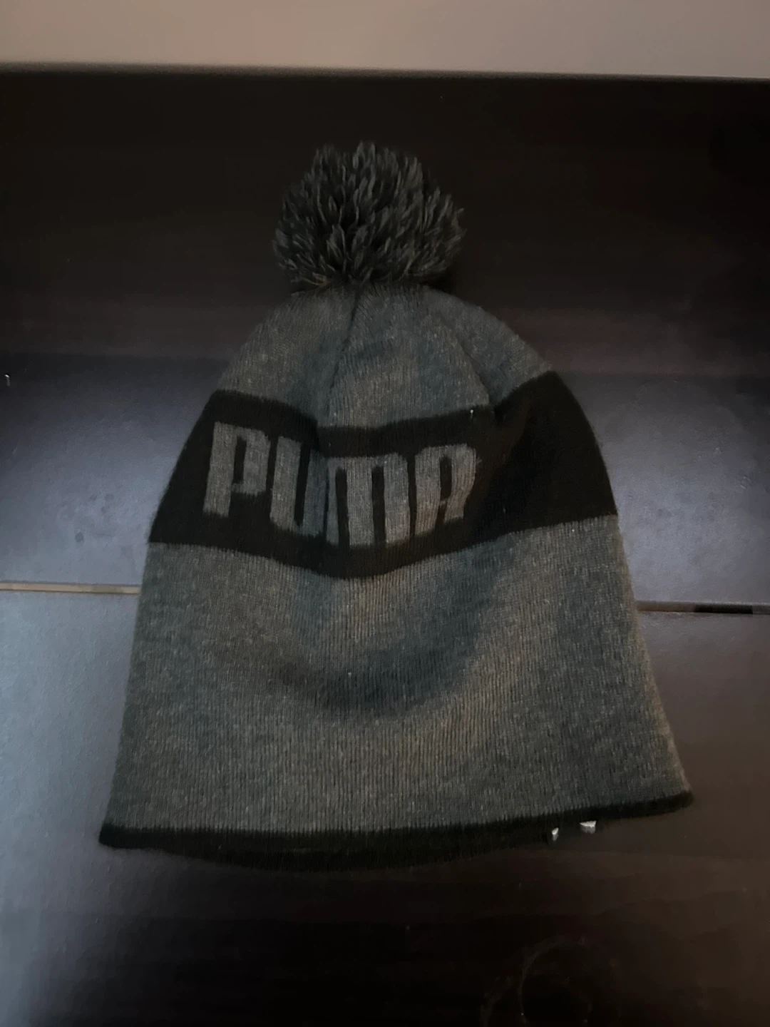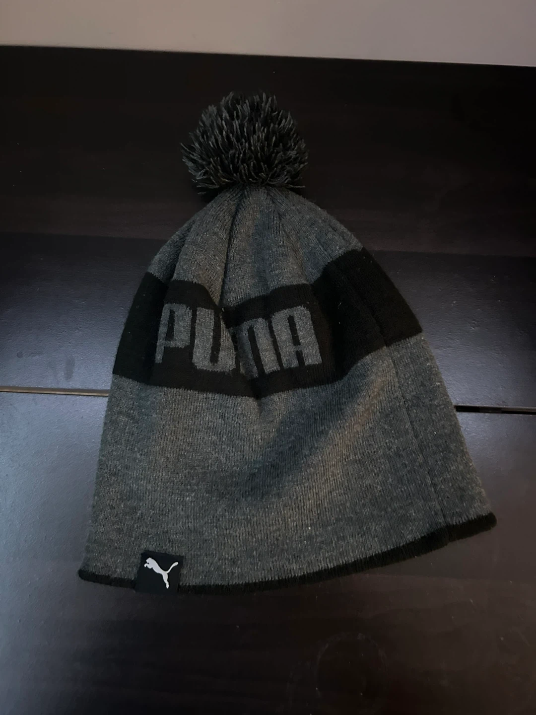 49Snug and stylish Puma beanie, perfect for keeping warm on chilly days! It features a classic pom-pom on top and the Puma logo for a sporty look. The beanie is a mix of grey and black, making it easy to match with any outfit. It's in great condition, ready for a new owner! Only been wear 2-3 times