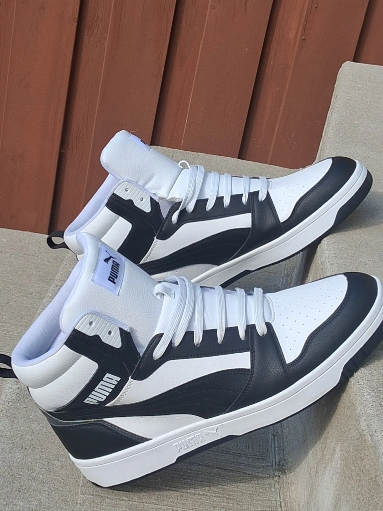 Here's a Unisex pair of Puma Rebound V6 Mid-top sneakers in size 13 ! These stylish sneakers feature a classic black and white colourway, perfect for lifestyle and basketball. The shoes come with the original box.