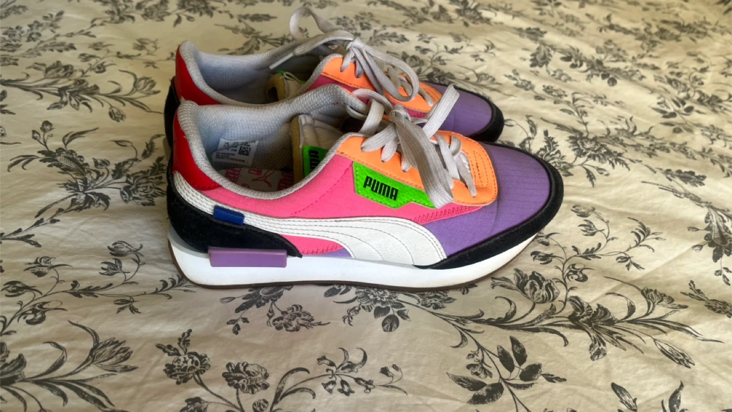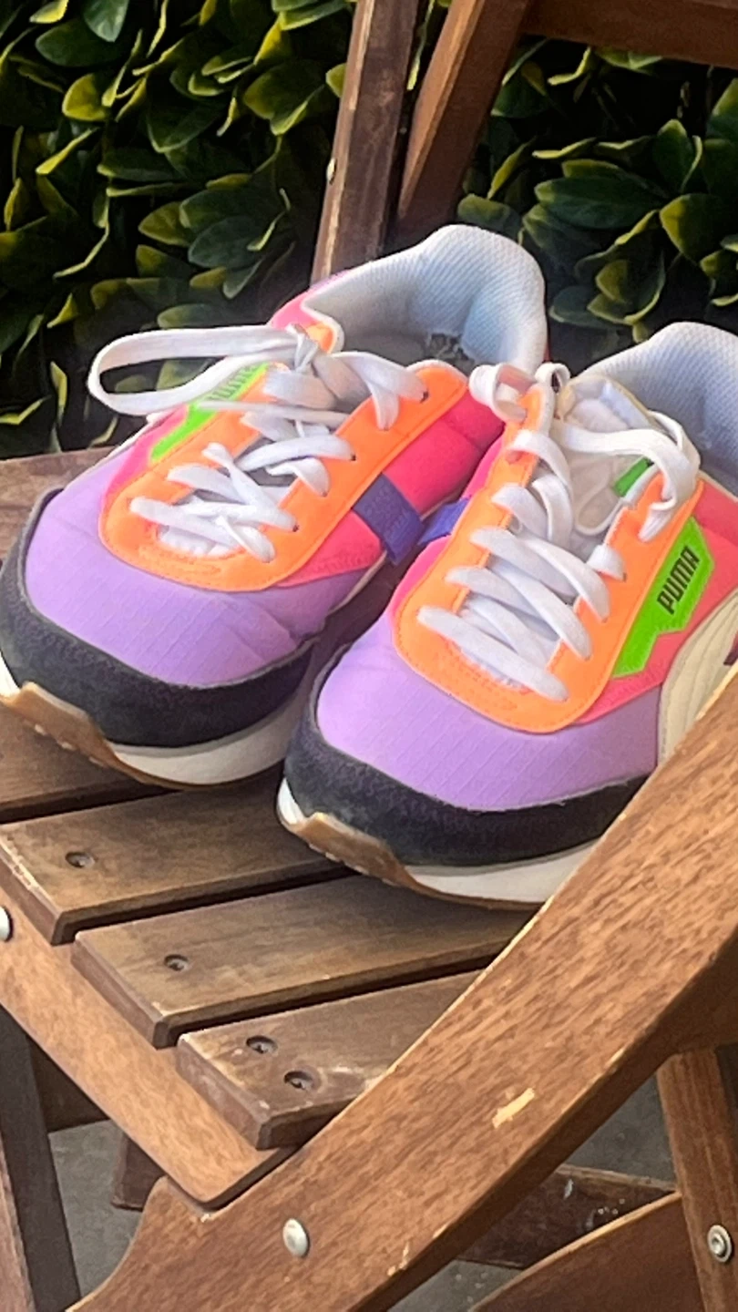 These Puma Rider FV sneakers are super fun and stylish! They have a cool mix of colours including purple, pink, orange, and green. Perfect for adding a pop of colour to any outfit. They're in great condition and ready for a new home!