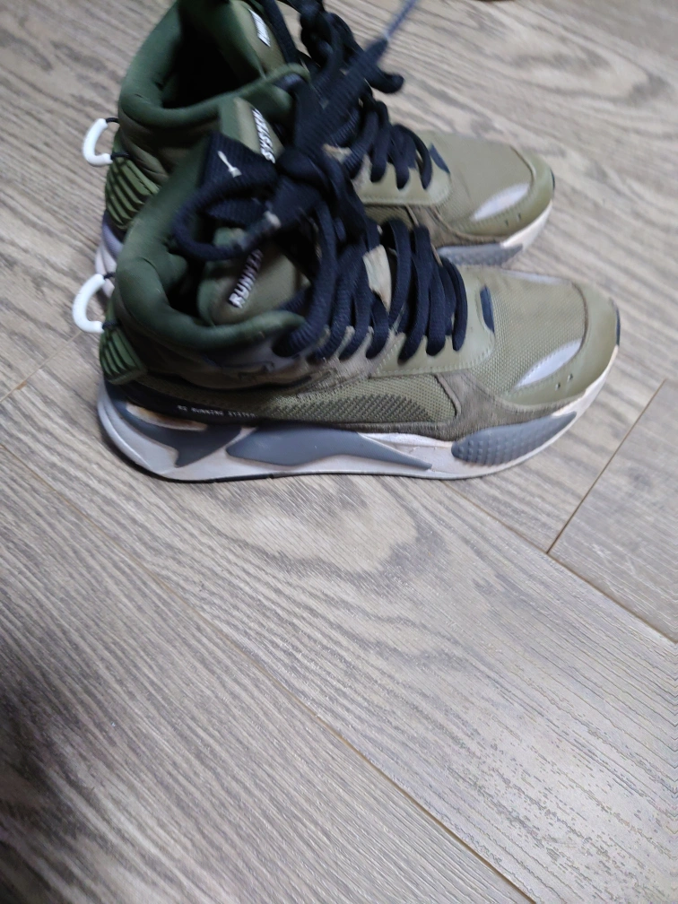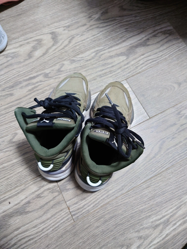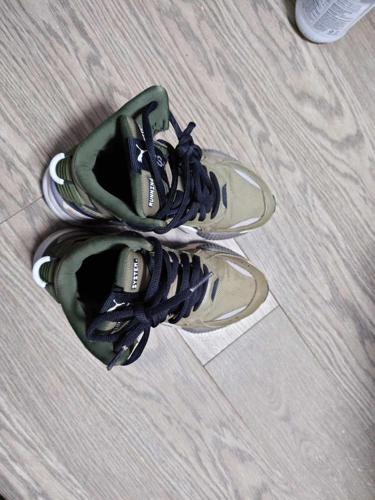Selling a pair of Puma RS-Running System sneakers in olive green. These are in great condition and ready for a new home! The 'Running System' text is visible on the shoe.