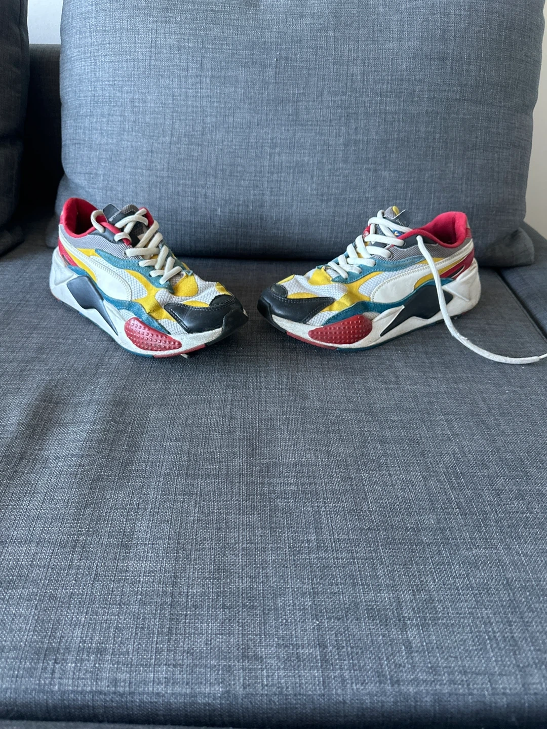 10Selling a pair of Puma RS-X3 athletic shoes. They're in good condition and ready for a new home! The shoes feature a colourful design with red, yellow, white, and black accents.