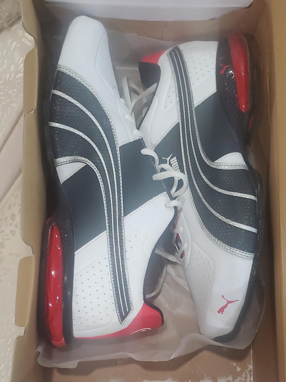 10Selling a pair of Puma sneakers! They come in a stylish white, black, and red colour combination. They are in their original box