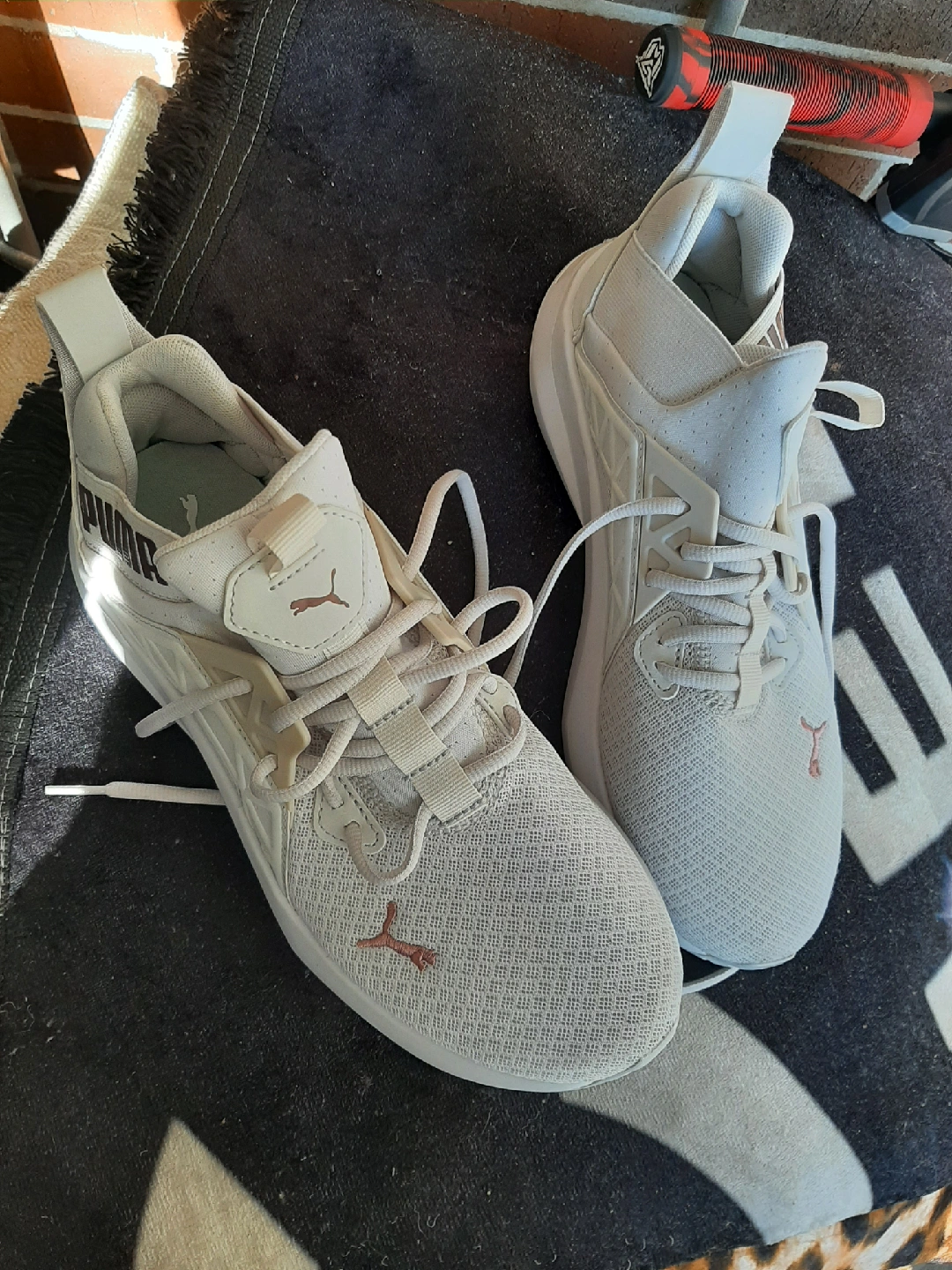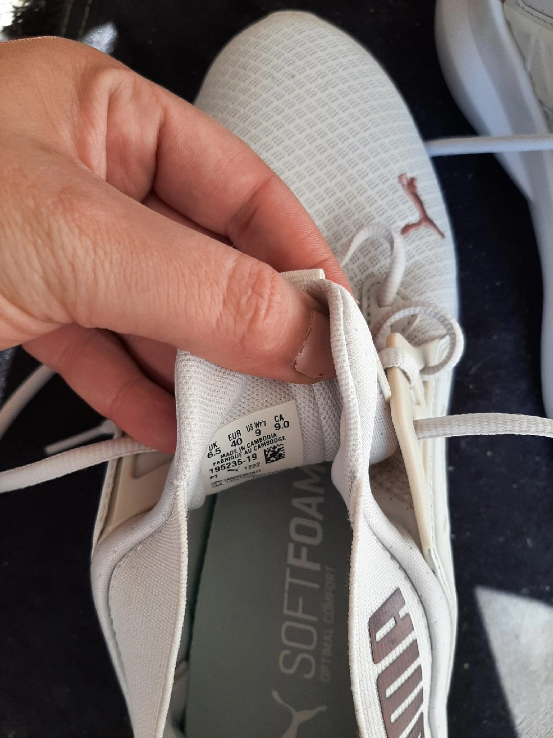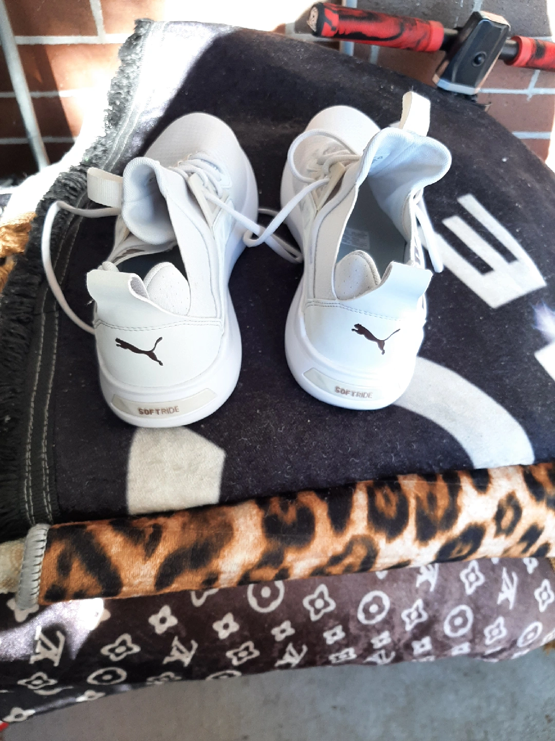 Selling a pair of Puma running shoes with SoftFoam optimal comfort. These are women's size 9. They are white with a maroon Puma logo. Perfect for running or everyday wear!